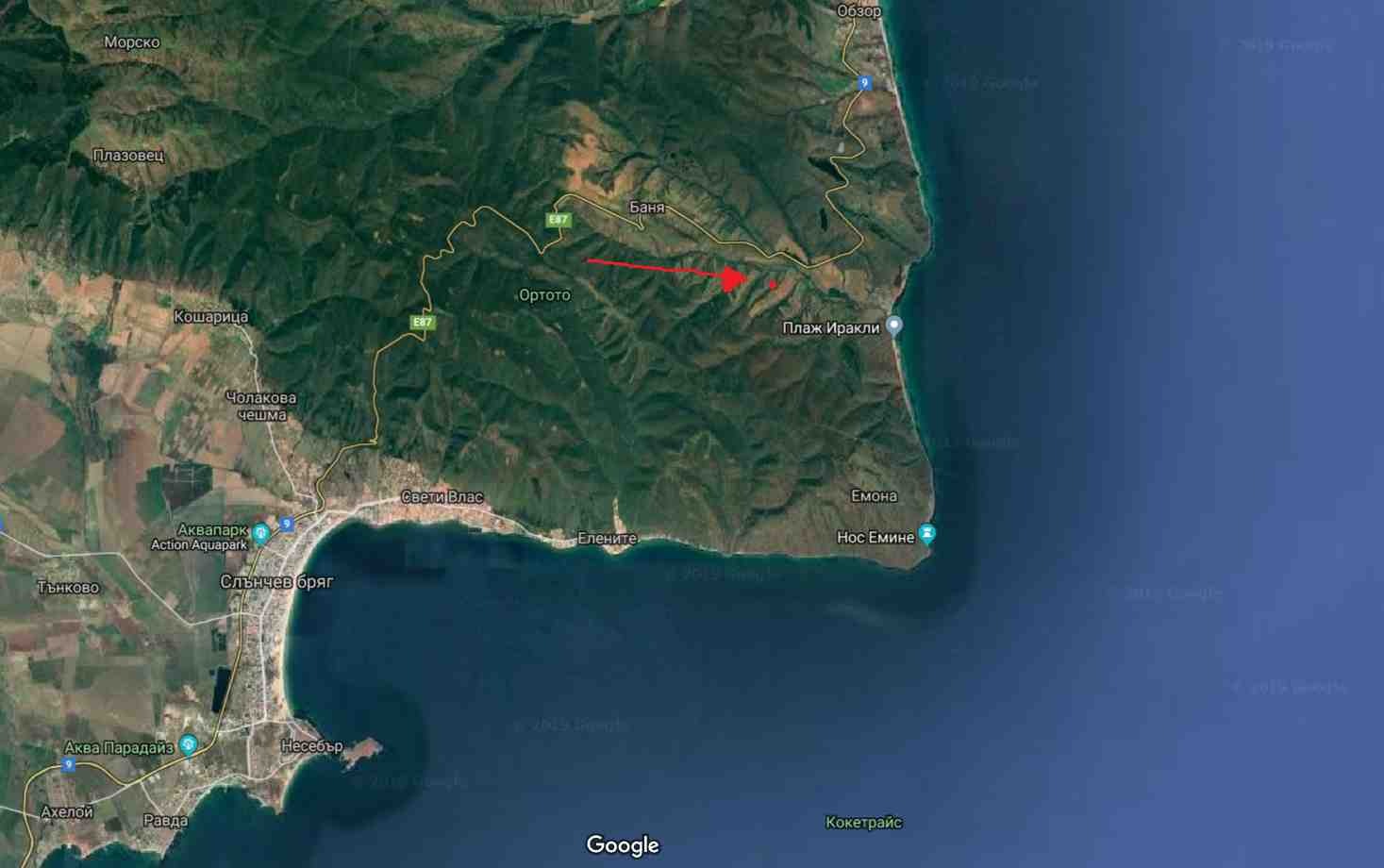 For sale is a plot of development land, 6934 sq. m near the village Banya. The plot is approximately 500 m. away from the main asphalt road, with direct access by a secondary road and approximately 1900 m away from the beach Irakli/ Vaya. 28 km away from Sunny Beach. Suitable for construction of villas like Свети Влад (on the picture) or solar panels or wind power turbines. Perfect for investment.