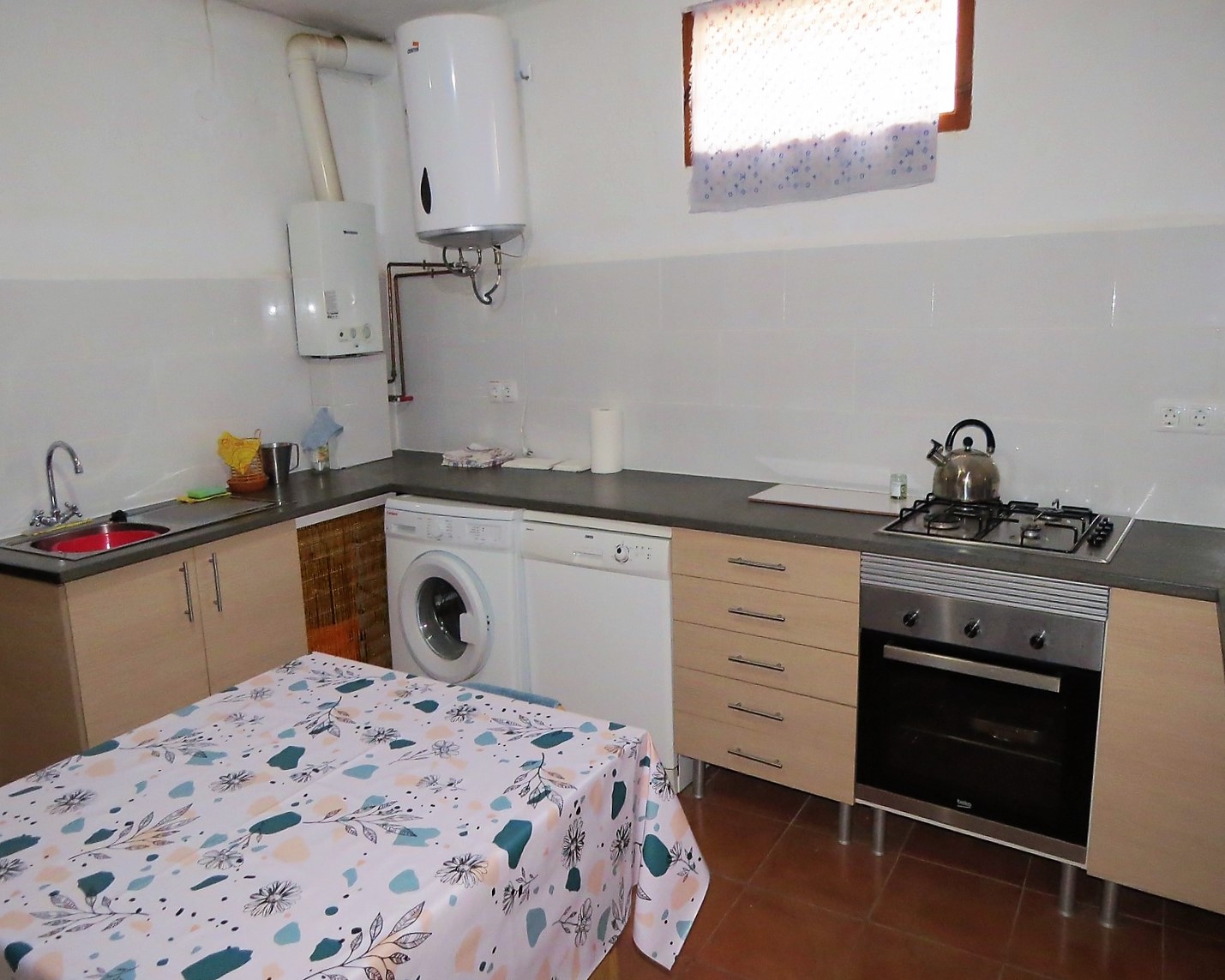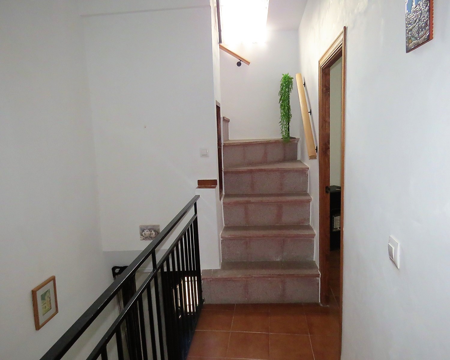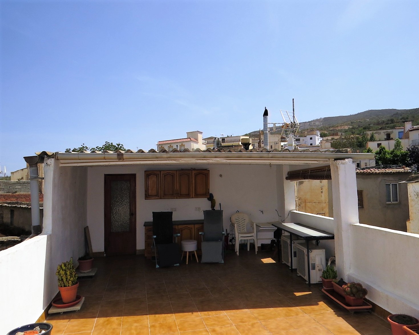 The upper floor has another bright double bedroom with built in bunk. Also from this floor is access to a large sunny roof terrace with great views. It is an ideal area for relaxing being partially covered and having an outdoor kitchen area with washbasin.