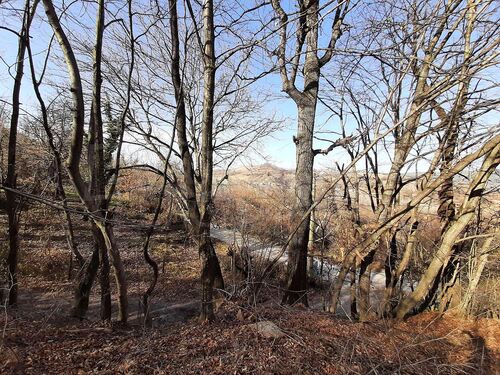 overgrown with vegetation and small trees.