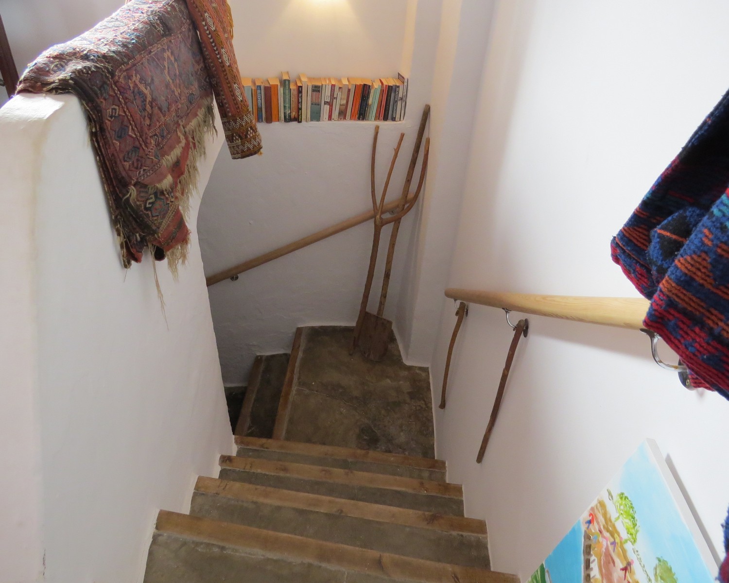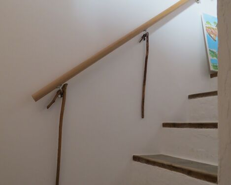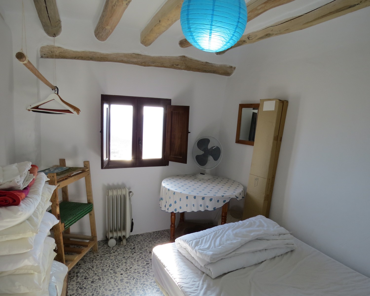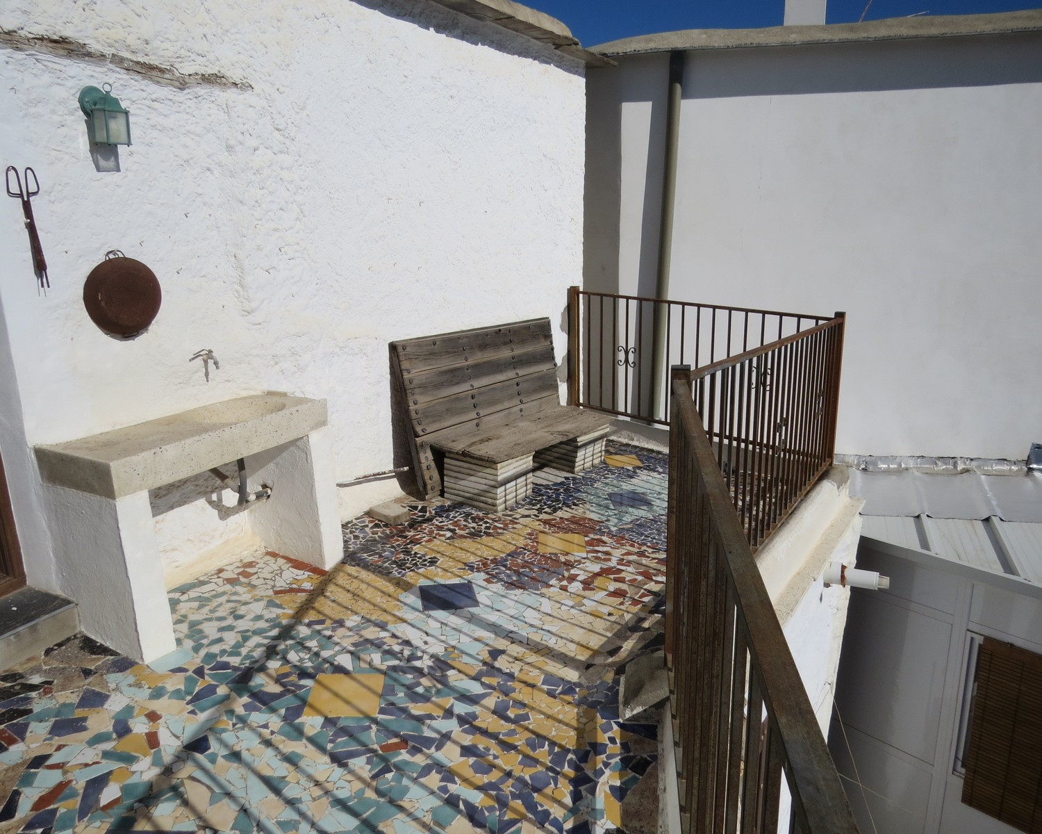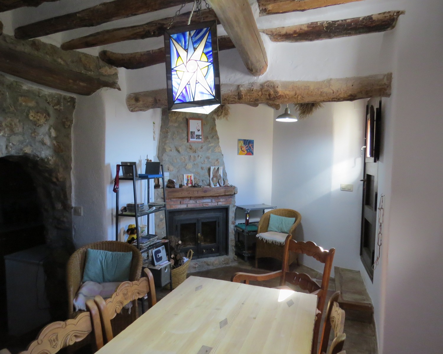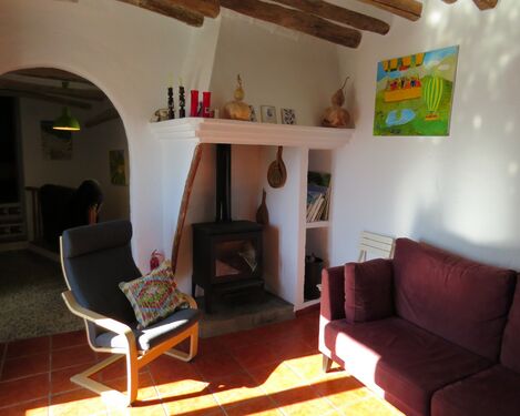 The dining area has stairs to the upper floor landing, two double bedrooms and a large open living area. The master bedroom has two sets of double glazed doors making it light and airy, one set open to a private sunny terrace. The living area has a wood burner and doors to a lovely mosaic floored terrace with stone washbasin, seating and again wonderful views.