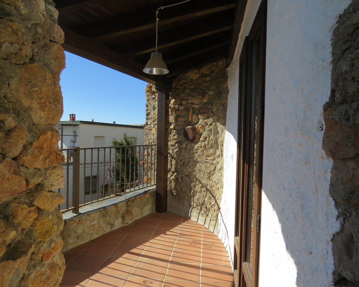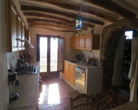 Further stone steps lead up to the side entrance to the house. This opens into a large dining room with traditional beams, floor tiles, a fitted wood burner and a door to the quiet street. Through a stone arch is the fitted kitchen with marble worktops, oven, hob, extractor, dishwasher, fridge/freezer and a larder cupboard. Double glazed doors lead out to a wonderful covered terrace and to an adjacent open terrace, both with fantastic views of the village and mountains.