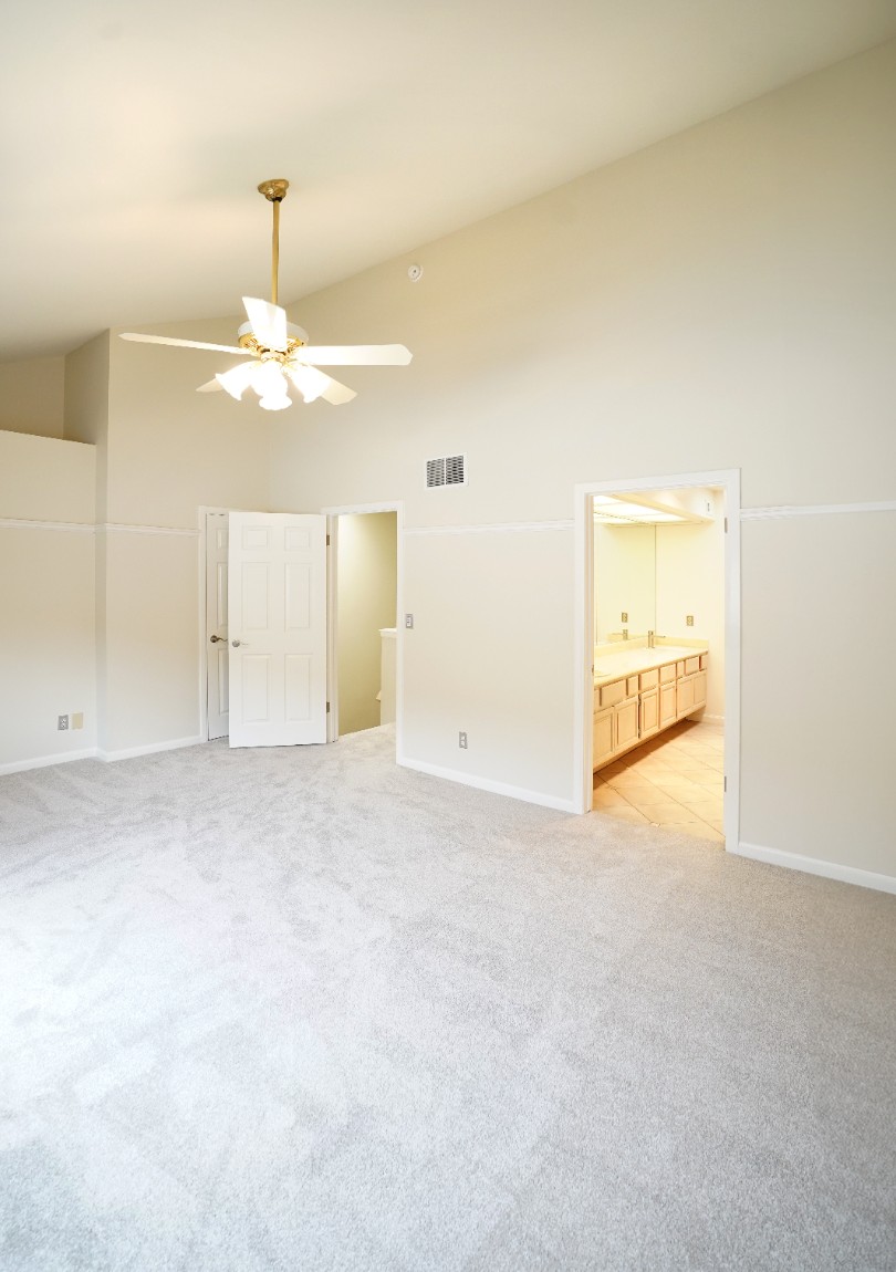 Each of the three spacious bedrooms includes its own en-suite bathroom, offering privacy and convenience for family and guests. The primary suite features vaulted ceilings, a walk-in closet, and a luxurious bath with dual sinks and a soaking tub. A main-level powder room adds extra functionality for guests.