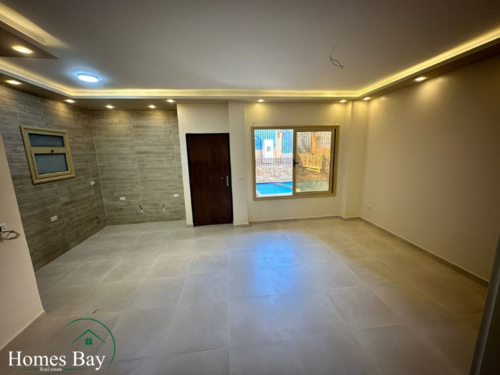 The apartment has a large living room with an open modern American kitchen and a huge window with a pool view. From the bedrooms you have a view of the palm trees and green spaces in the streets of Magawish.
