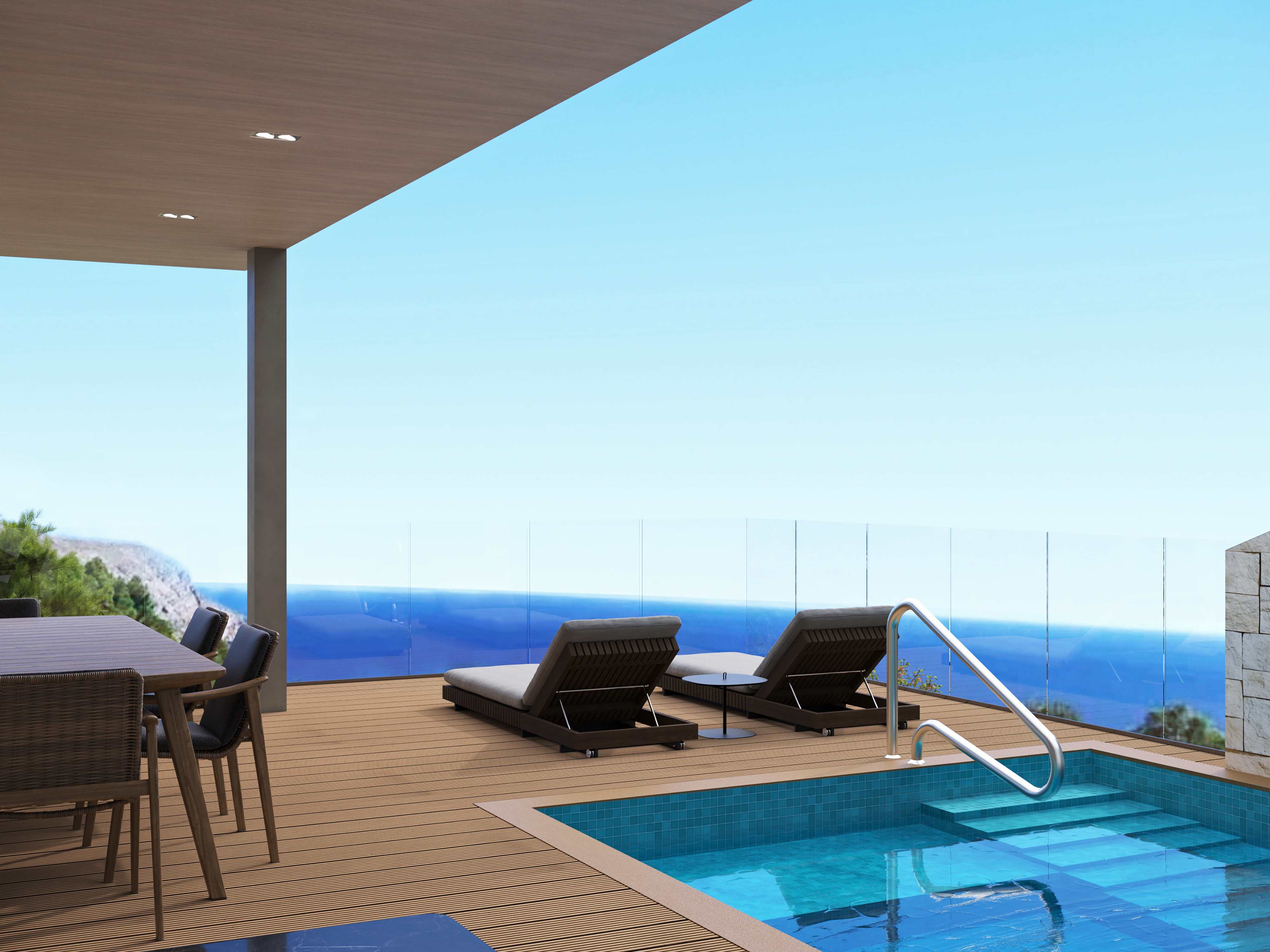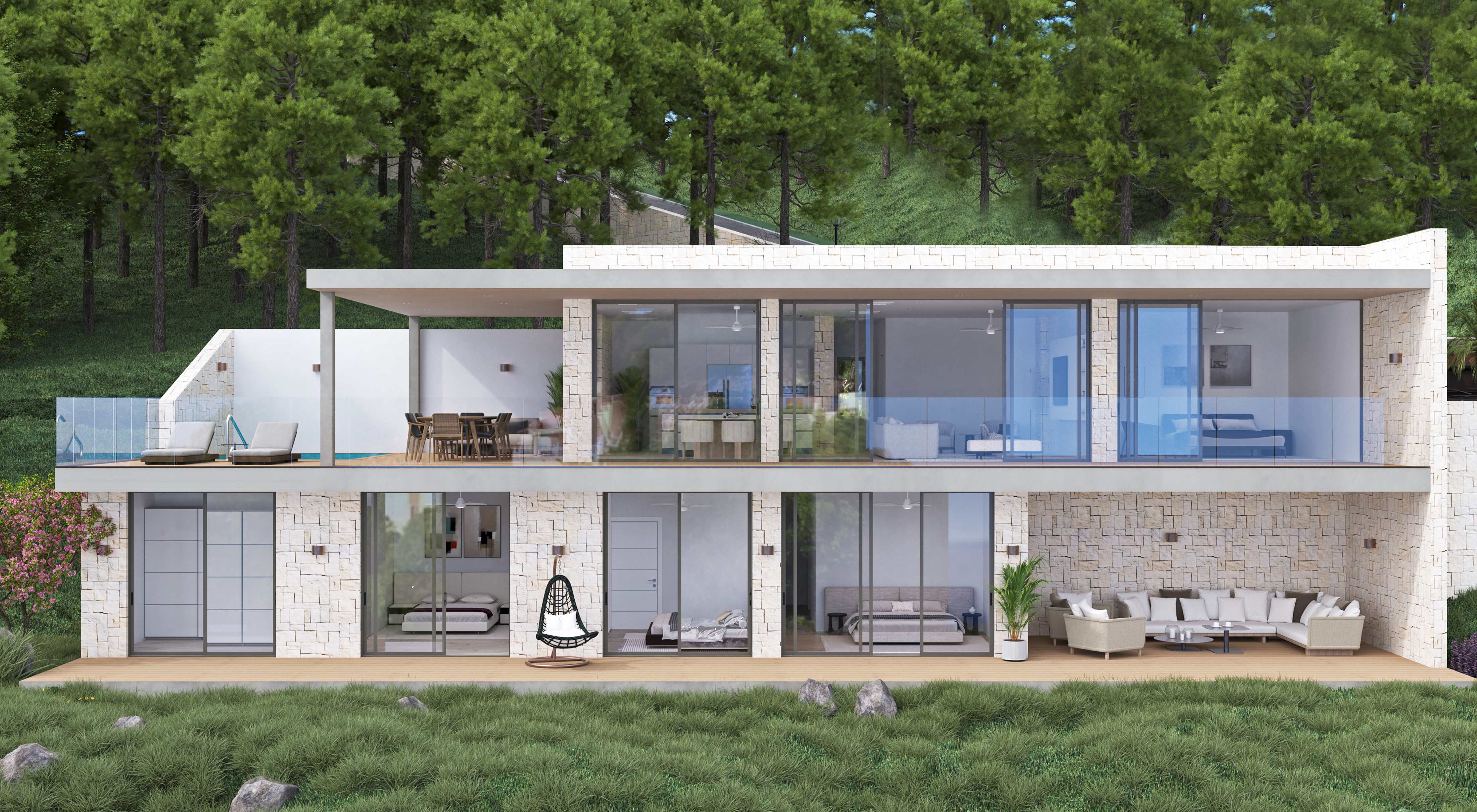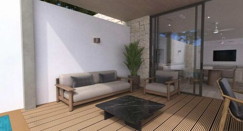 10 years warranty, new system of building with steel framing + artisanal finish with real stone. High quality windows from floor to ceiling that can be opened to extend the rooms to the outside of the villa. Big terrace of 25m total length with large porches to create maximum shadow for the warm summer sun.