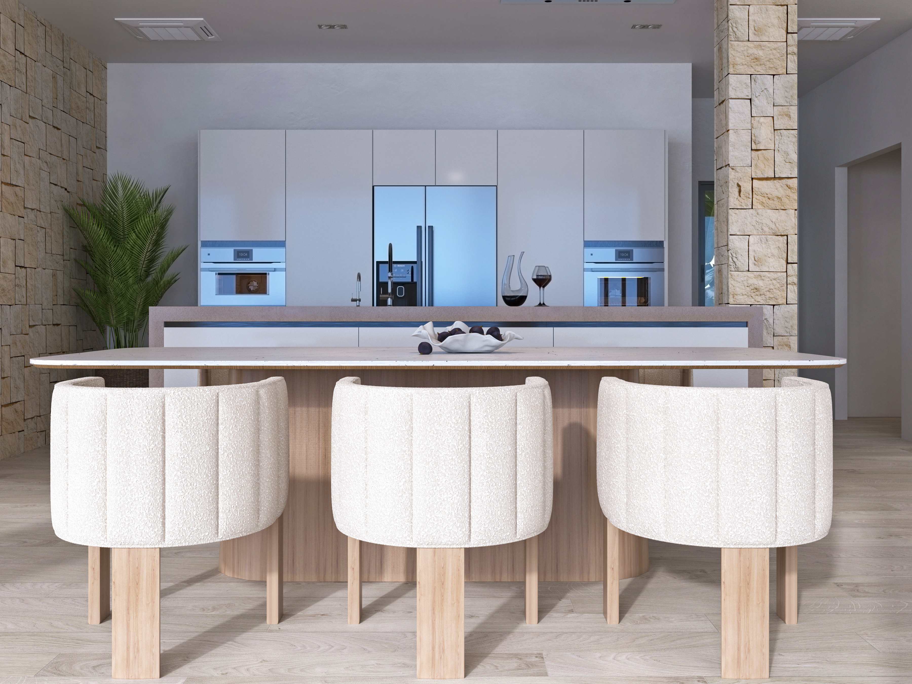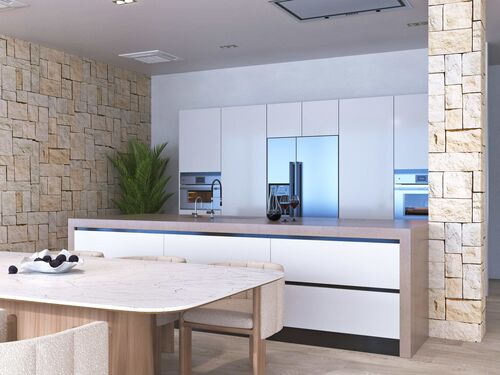 Equipped with all top‑of‑the‑line cooking apparatus including American fridge and big kitchen island with ceiling‑integrated air extraction and remote control.