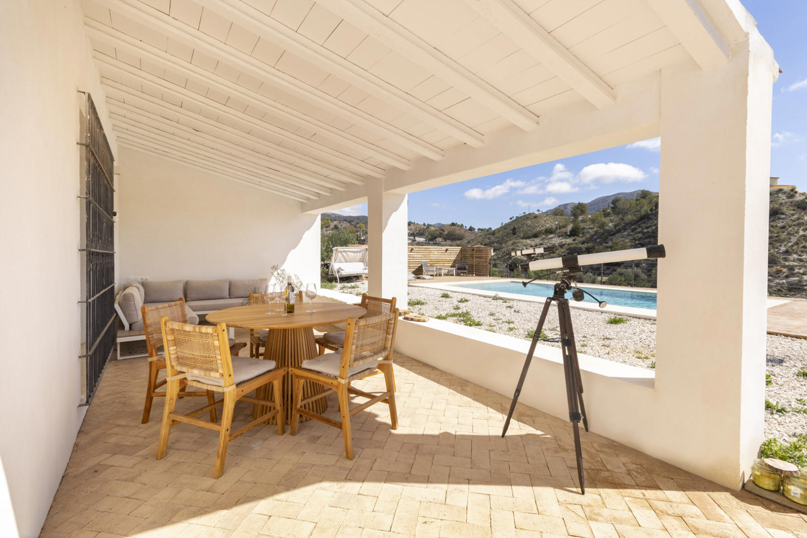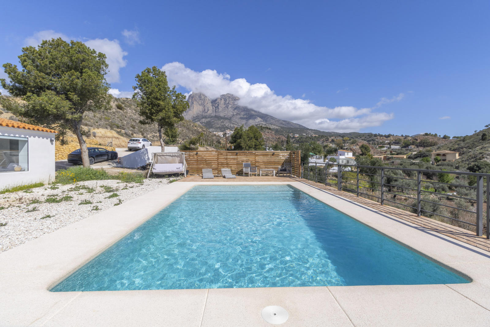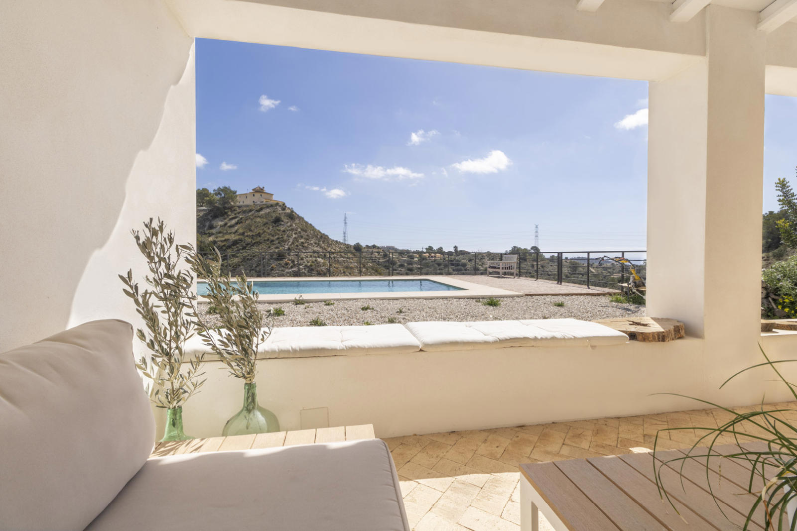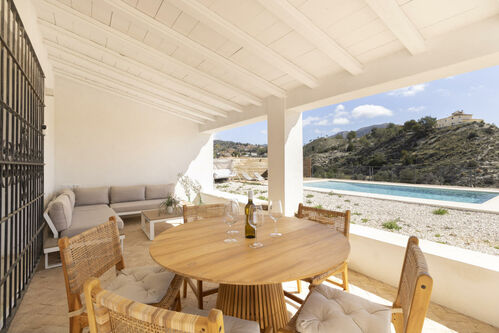 Outside, a large covered porch is the perfect place to enjoy the Mediterranean climate, while the private pool invites you to relax with breathtaking views of Puig Campana. A separate guest house on the property is ideal for hosting visitors with total privacy.