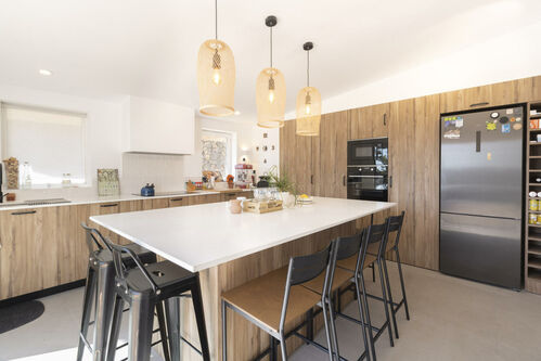 At the heart of the home is a large open-plan living space with a modern island kitchen, fully equipped and complemented by a hidden utility area for added functionality. Large windows flood the interior with natural light and offer panoramic views of the surrounding nature. Pellet fireplaces in both the living room and main bedroom provide warmth and a cozy touch during cooler months.