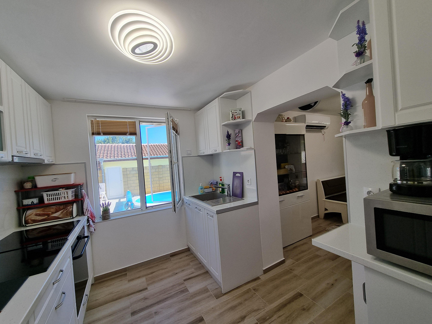 The 920 m² plot around the house conveys a sense of coziness and independence, divided into two equal parts: one half designed as a garden, the other encompassing the house with the pool.