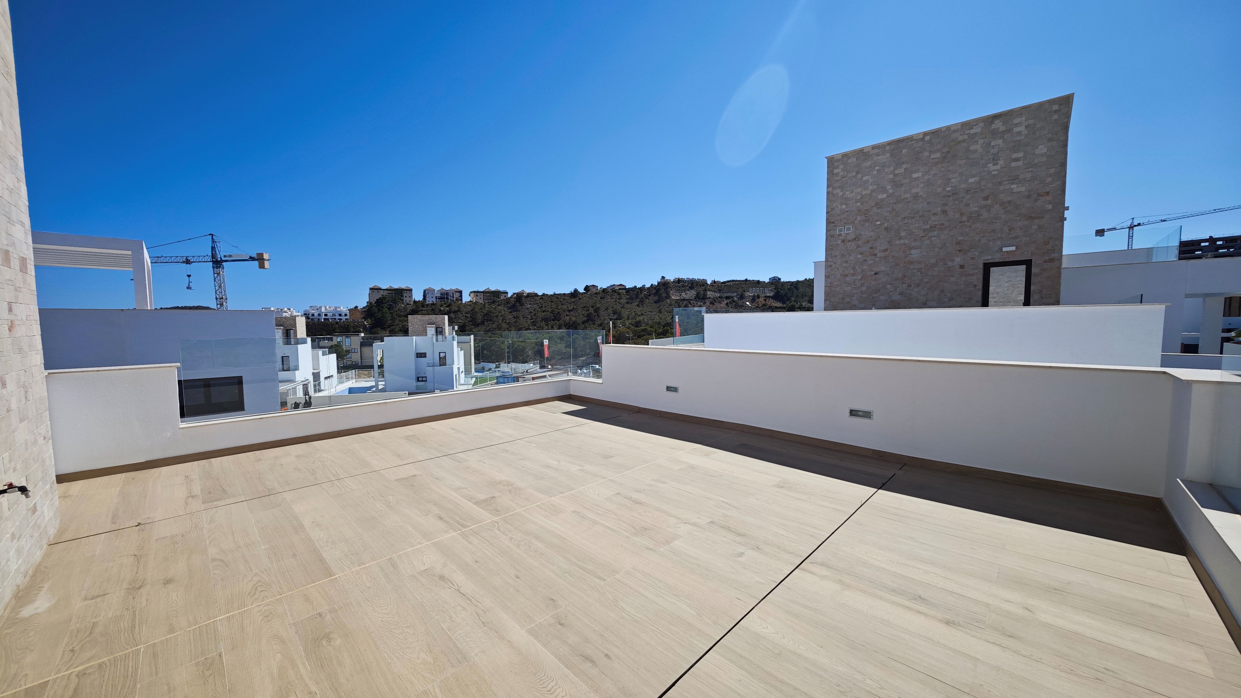The villa was built in 2023–2024 and sits on a 595 m² plot with a total built area of 320 m². It features 4 bedrooms, 3 bathrooms, two spacious living areas, a fully equipped kitchen and two terraces with open views.
