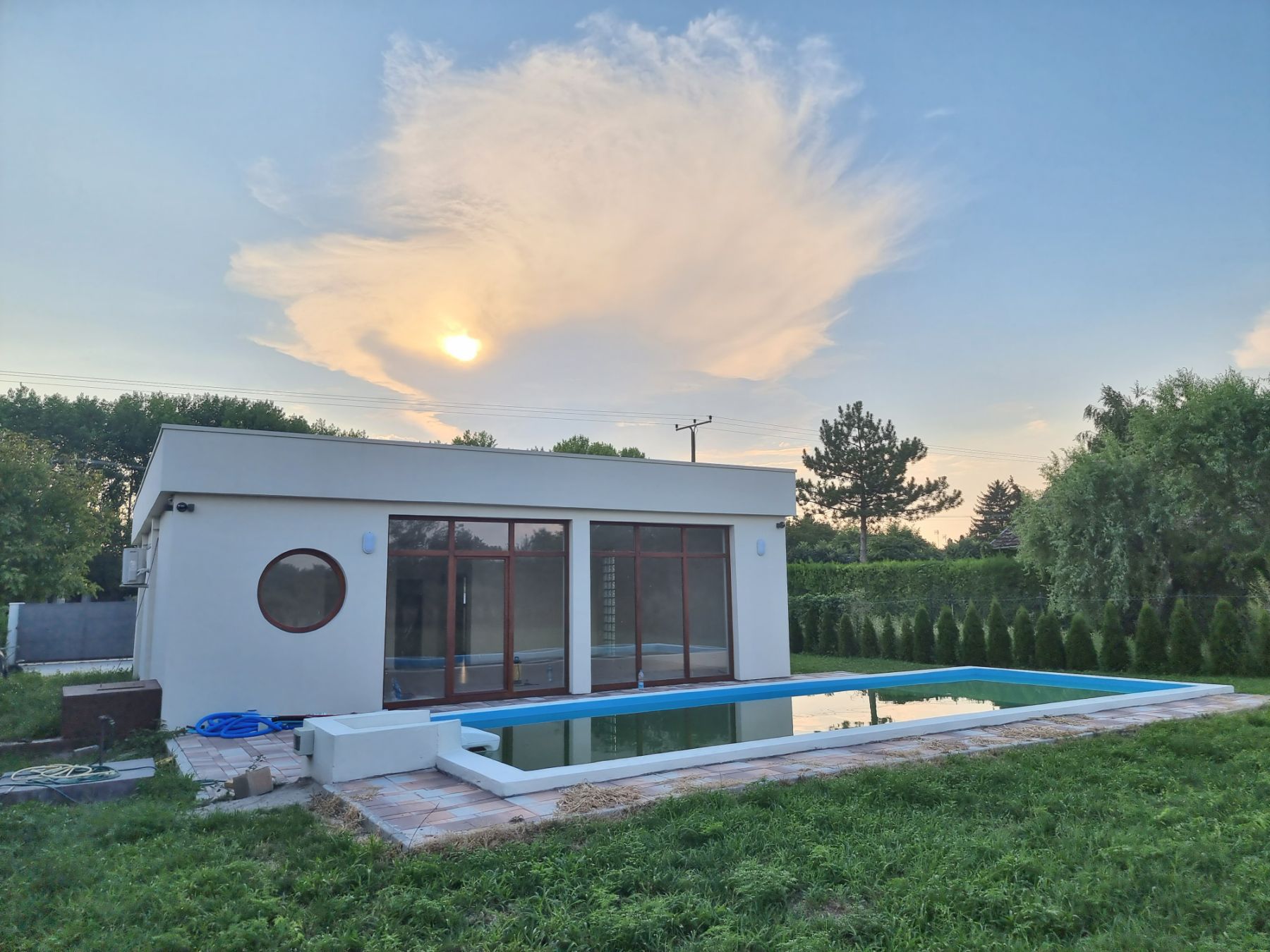 Building area 100 square meters - 2 bedrooms, 1 bathroom with shower, open space (kitchen - dining room - living room). Lots of natural light, woodwork (windows, doors). High ceilings - 2.80 cm give the impression of an even larger space. Floor - tarket and tiles. New and ready to move in. Beautiful view of the pool and greenery. High-quality construction, excellent insulation. Maximum privacy, comfort, modern and unique facility in Palic.