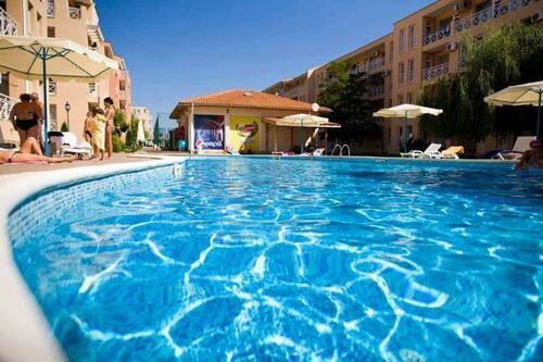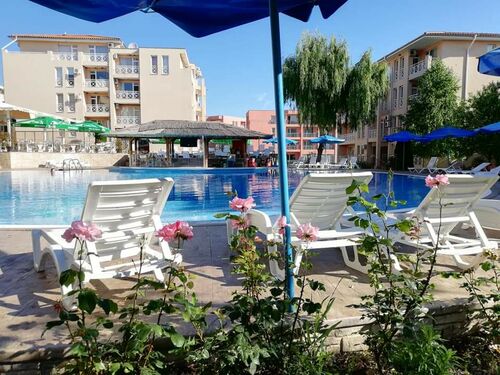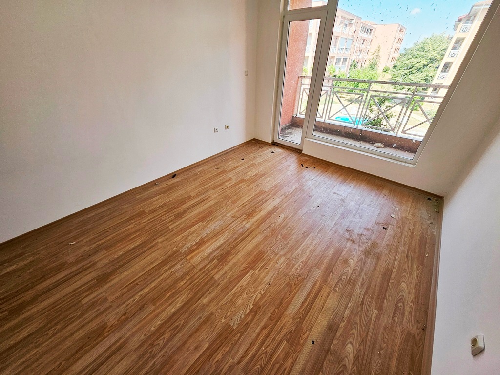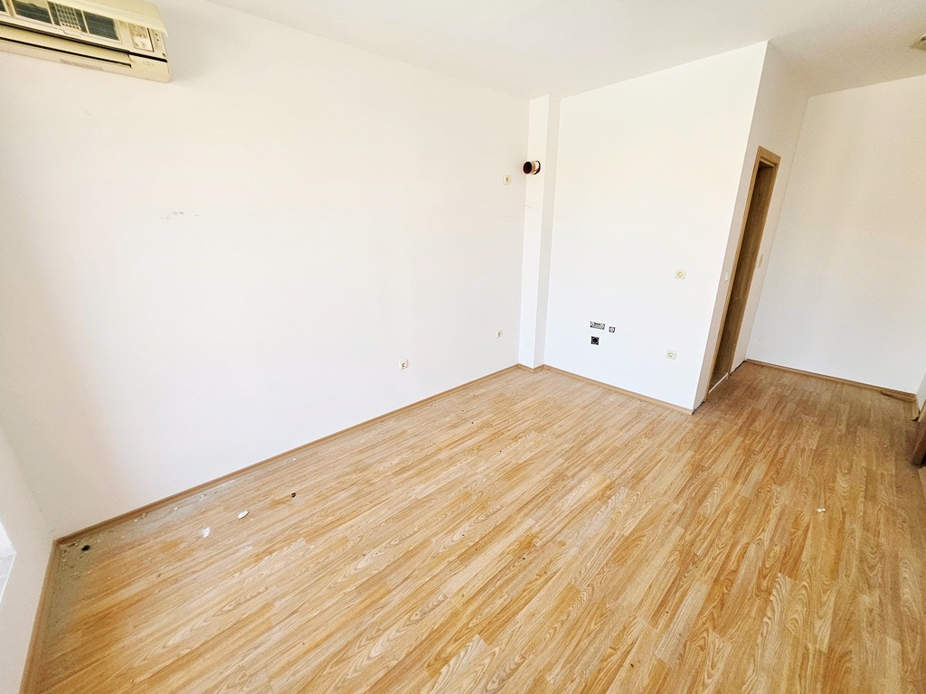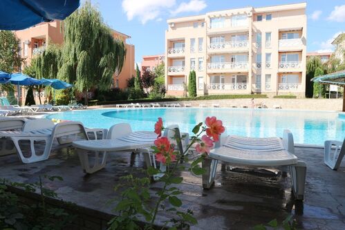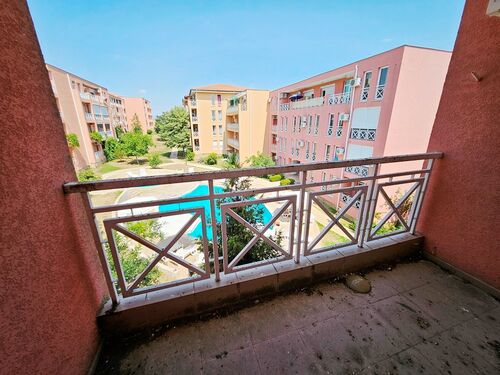 We offer for sale a nice studio in a gated complex, in a quiet and peaceful location, just 3 km from the golden beaches of the elite seaside resort of Sunny Beach. The complex has a large area and is well maintained, located in a quiet and peaceful location with great amenities for outdoor activities. The apartment is located on the third floor and has a nice view of the pool. The annual maintenance fee is 580 euros. The fee includes security, video surveillance, maintenance of pools, green areas, common areas, use of sun loungers and umbrellas, children’s playground, tennis court, playgrounds, mini golf. The complex offers its guests an outdoor pool with a children’s pool, tennis court, mini golf, football field, restaurant and bar, parking, security, playground. The complex has act 16.