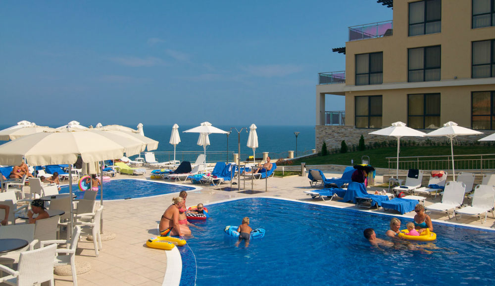 New apartment with two bedrooms and fantastic views located in a holiday complex 50 km away from the city of Varna, Bulgaria. The apartment is located on the third floor and is furnished and ready for living. It has two bedrooms, two bathrooms, living room with kitchen corner and a terrace with nice panoramic views towards the sea. The complex where this property is situated is in a small resort town about 50 km from the city of Varna, 65 km from the city of Burgas and 40 km from the famous sea resorts Nessebar and Sunny Beach.The gated community offers to the owners and guests a whole variety of services like 24 h. reception desk and security, personal vault, currency change, airport transfers, spa and beauty center, supermarket, games room, parking, wireless internet and satelite television, two restaurants, big swimming pool with a smaller pool for children, animation team for the children and much more. The beach is situated right under the complex only meters away. It is property of the holiday village and offers unique golden sand and great opportunities for water sports, a lot of sun and great views. The center of the small resort town is also not far away from the complex. There is regular bus transport to here both from Burgas and Varna and also from the capital city Sofia. The owners of flats in the complex can use some of the services for free while for the rest of them they get discounts starting from 10 %. Also every buyer can receive a personal payment plan and