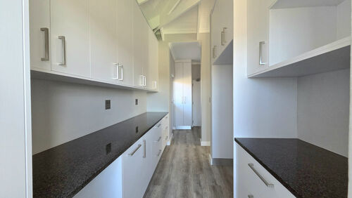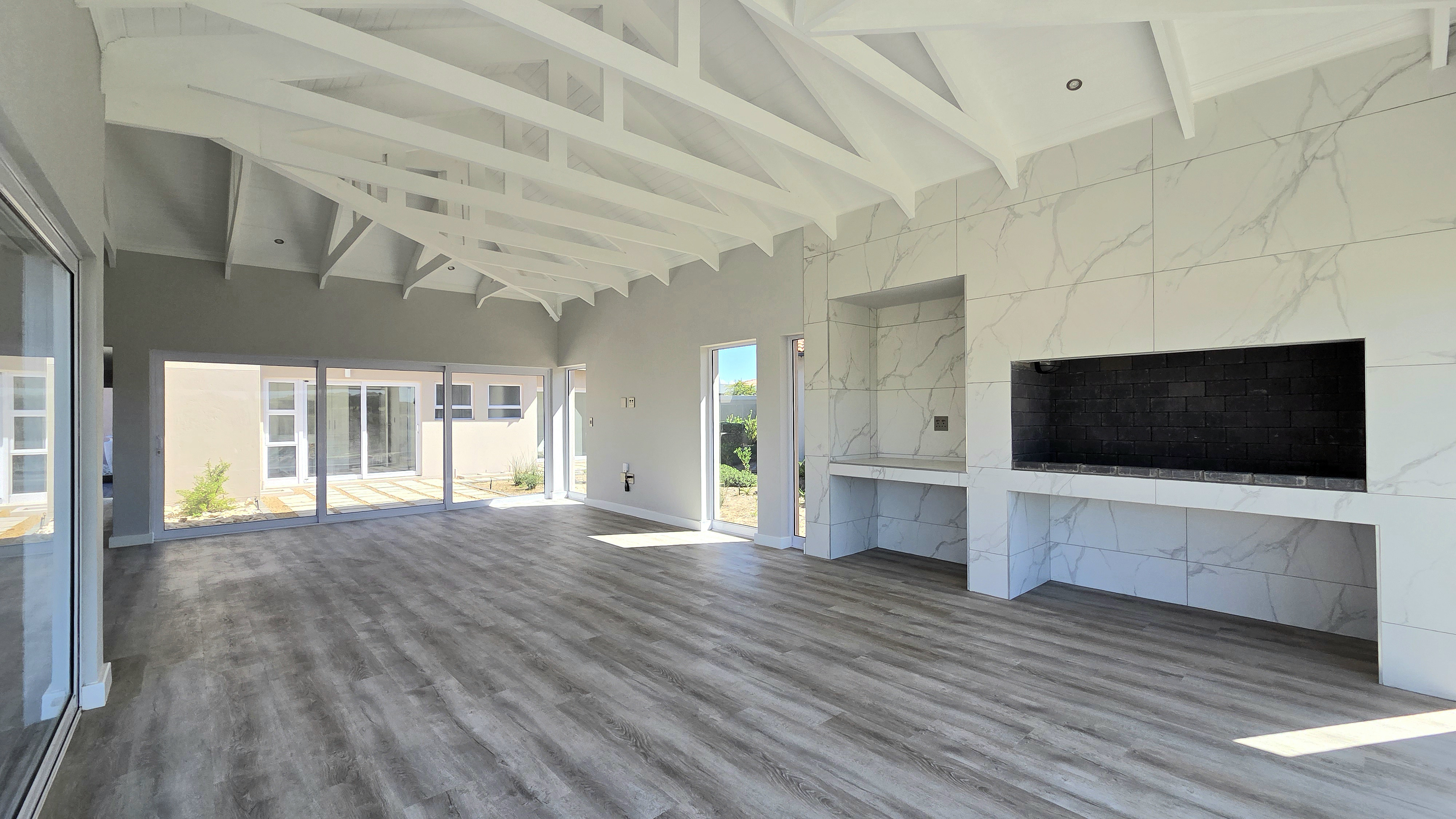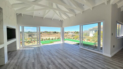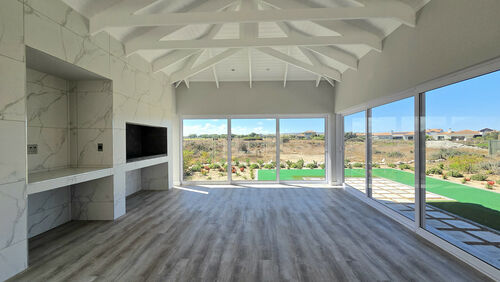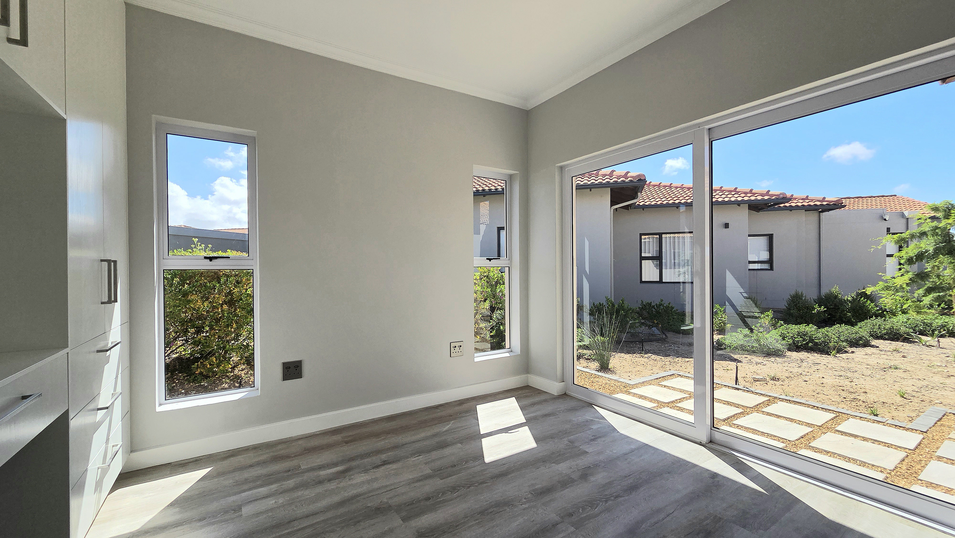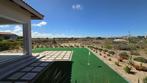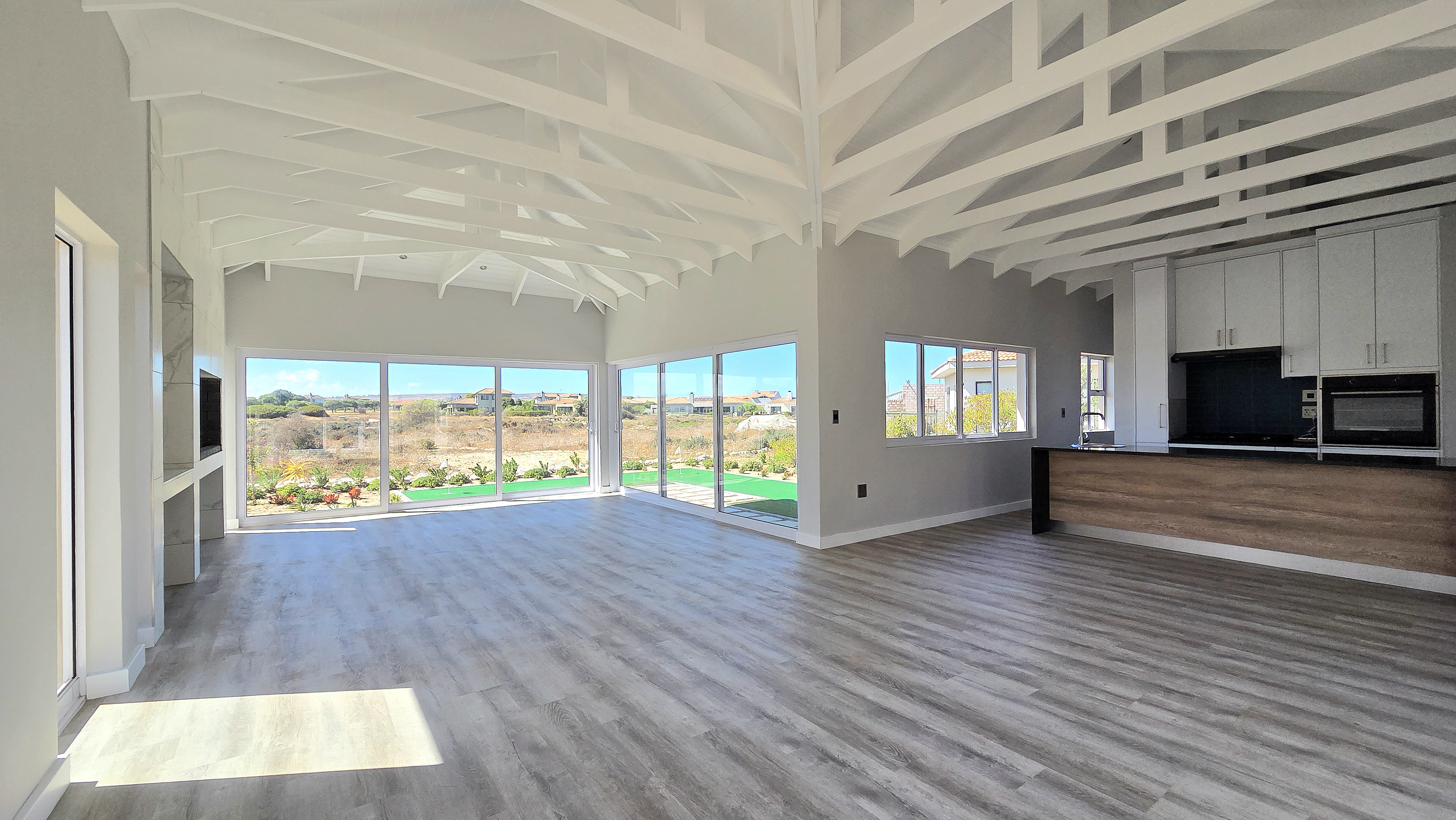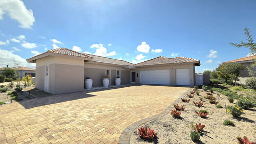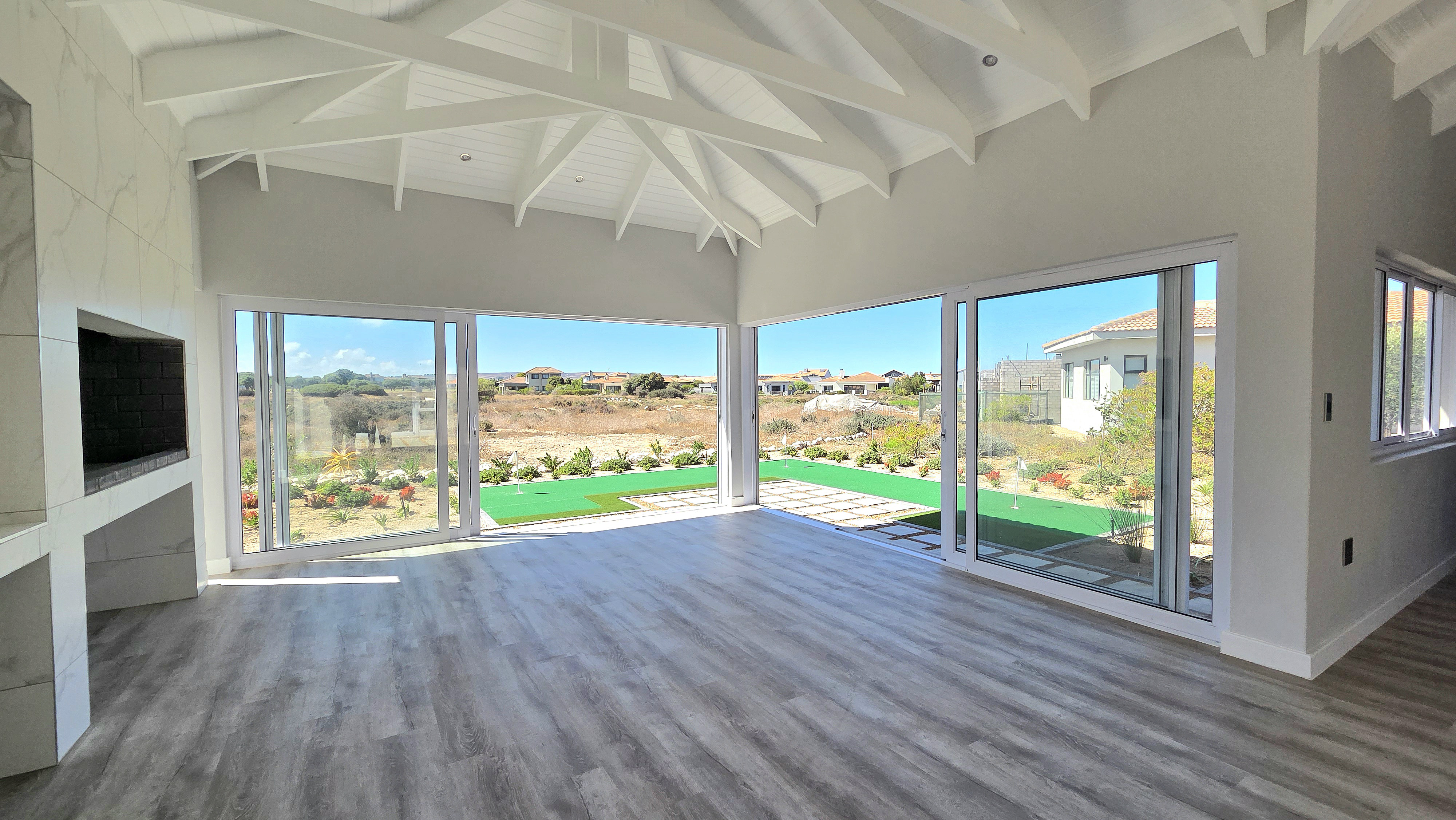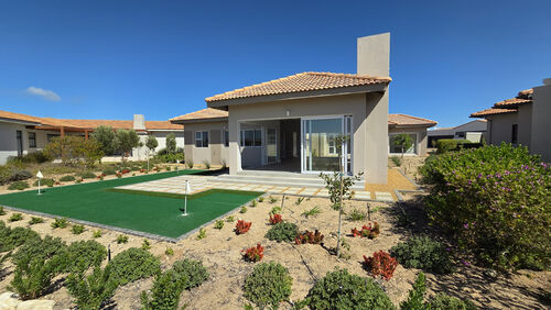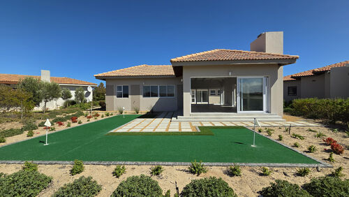 Inside, high-volume ceilings and an open-plan layout create a bright, spacious feel. The kitchen forms the heart of the home, offering sleek finishes, a central island, separate scullery and seamless flow into the dining and living areas with an indoor braai, ideal for easy entertaining. Large sliding doors open to a private patio, landscaped garden and your own putting green overlooking the course.