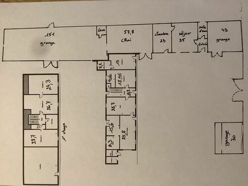 Large barn with upper floor, garages, workshop