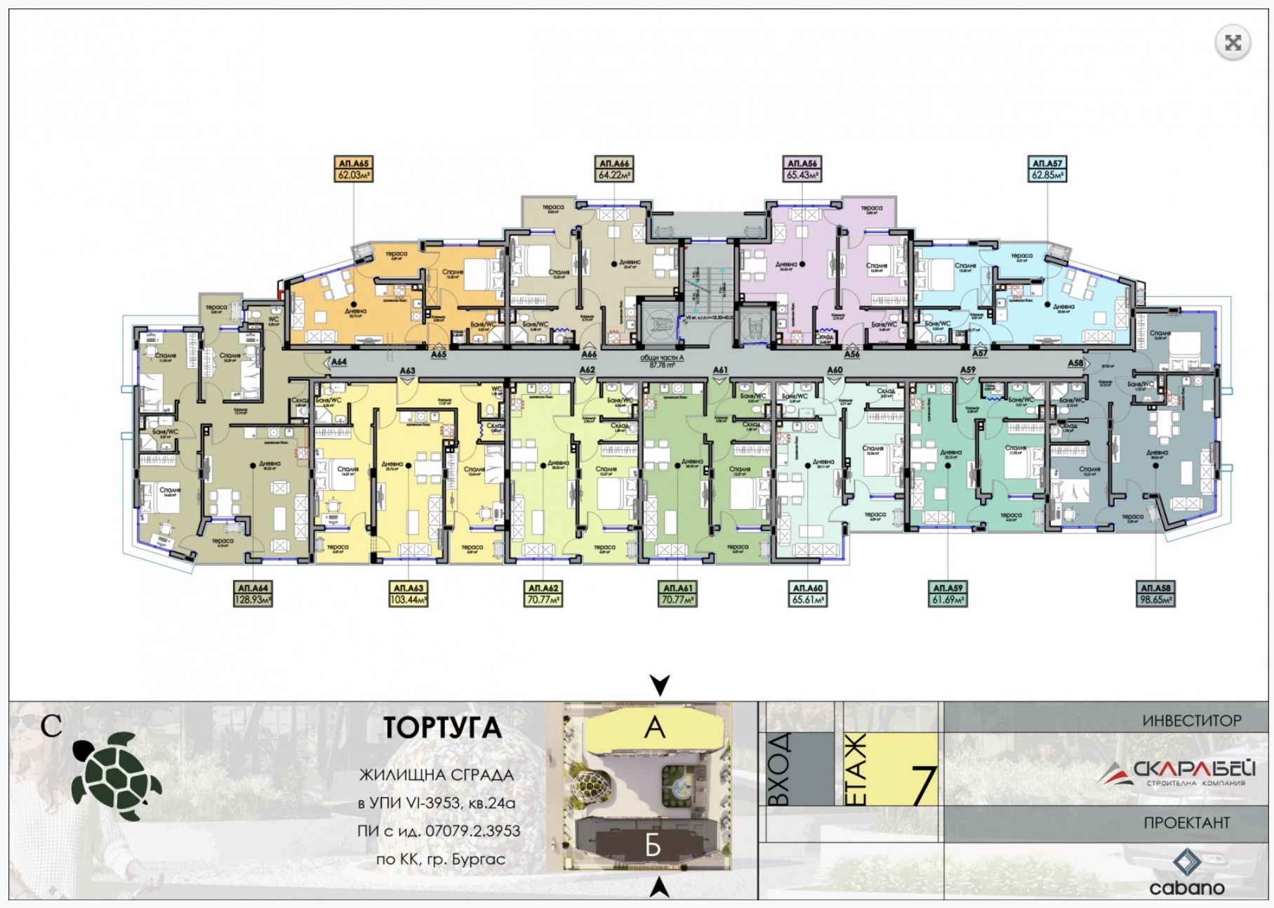 We present apartment A57, located on the seventh floor of the residential building SKARABEY TORTUGA, a modern development by the construction company SKARABEY BUILD, situated in the fast-developing Horizont district of Burgas.