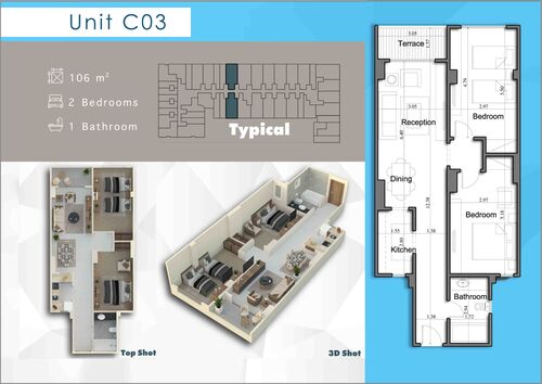 This 2-bedroom (107m2) apartment (unit 534) on the 3rd floor in 3 Pyramids is still available for this summer.