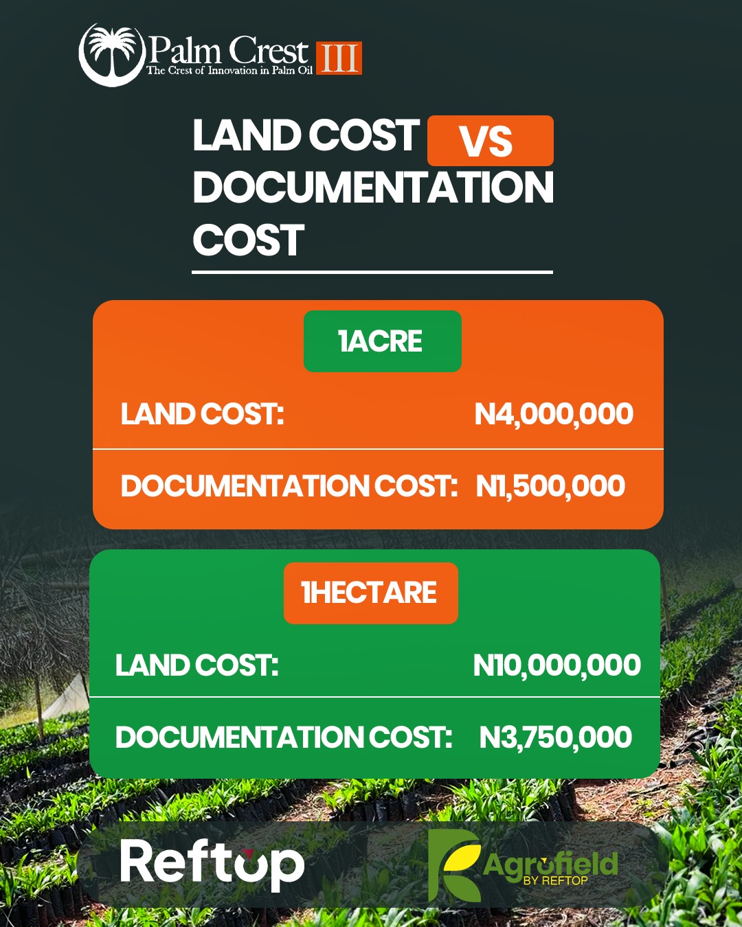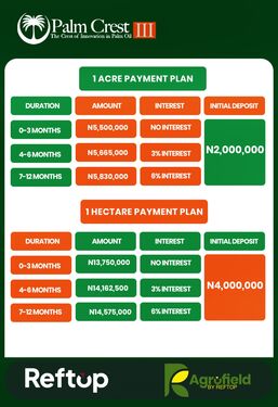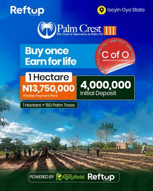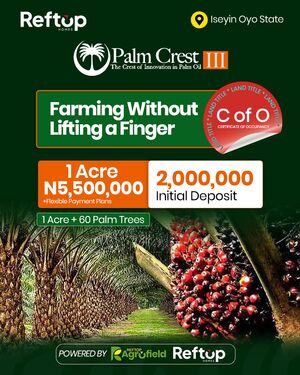 PALM CREST PHASE 3, ISEYIN OYO STATE A flagship agro-real estate project combining land ownership with structured palm plantation investment. At Palm Crest, investors own titled farmland while operations from planting to harvesting are professionally managed, creating a passive, long-term income stream tied to Nigeriaโ€™s growing palm oil demand. Own a Piece of Nigeriaโ€™s Thriving Palm oil Industry! THE STRUCTURED AGRICULTURAL ASSET Palm Crest Phase 3 represents the next evolution in structured agricultural ownership. It combines: - Titled farmland ownership - Professional plantation management - Integrated processing infrastructure - Commodity-linked returns - Long-term generational asset creation - Own the land, own the plantation & own the produce This is not; - Speculative farmland - Pooled crowdfunding - Fixed-return agricultural marketing