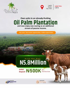 Palmrich Phase 5 is a thriving Agro-Real Estate property, with an exclusive opportunity to own already fruiting Oil Palmtrees, allowing you to start harvesting and earning immediately you take possession This estate is suitable for instant returns as well as long-term passive income.