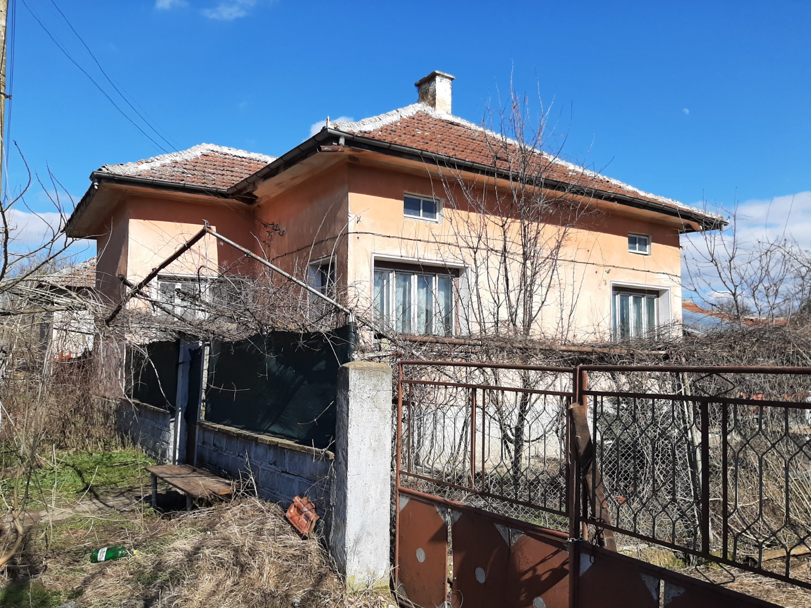 Country house with annex, garage and plot of land situated in a village near river 60 km northwest of Vratsa, Bulgaria. The property is located in a quiet spot within the limits of the village. The main building has one floor and consists of lobby, corridor, premise for kitchen, living room, two bedrooms, storage room and shower room with toilet. Bedrooms receive passive solar heating during the year and good light as they are facing south. The house has new plumbing, new cesspit and some job was done on the wiring. The roof was inspected and the bathroom in the main building is brand new. There are also new floors in the corridor and the kitchen inside the house. Wring was revised and updated. Next to the house is the annex which holds outdoor sitting area, shower room with toilet and living room with kitchenette. The property has main water supply as well as a private well which is conveniently located close to the house. There is also a garden tap not far away. Beyond the summer kitchen there are several sheds with light and electrical connections. They have been used for animal shedding and furniture storage, as well as workshops. The garden beside the house is fenced too. To the left of the property is a mechanics garage opening directly out to the street with secure steel doors, cupboards and shelving, a work channel cut into the floor and plenty of room for parking up to three cars beside the garage off street behind a wide double gate. Beyond it are several sheds for animal raising and storage. Garden plantings include herbs and fruit trees, with apples trees of different varieties for eating and cider production, sloe plums for gin, cherries for cherry liquors and red and white table and wine grapes planted. There are also some bee frames and equipment, with bees having been kept on the property in the past for honey and mead. There is a cask and bottles in the basement which is ideal for winemaking. The center of the village is about 10 minutes away by foot from the house. There one can find a grocery store, café-bar, the local post office, school, library, park and mayor`s office. There is a small river passing through the area and joining a bigger one about 3 km outside the settlement. There one can find plenty of nice spots for fishing, camping and hunting. Easy walking distance to a children’s park play area and the local kindergarten. Rural property with lots of potential at a good price ready for someone to come in and finish it.