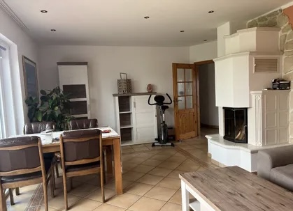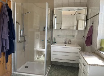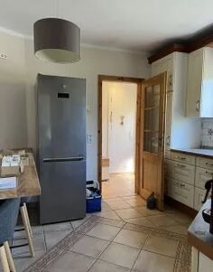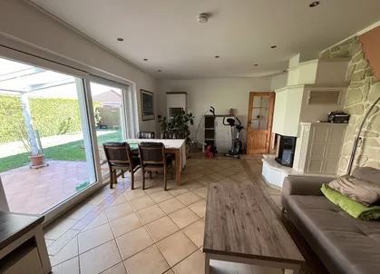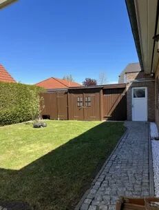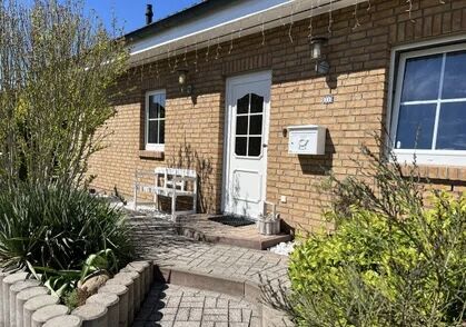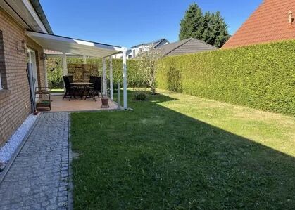 English: Detached house in bungalow style on a sunny garden plot in a very quiet location in Französisch Buchholz for rent. 4 rooms, kitchen with utility room, bathroom. Ideal for up to 5 people. Underfloor heating throughout. Fireplace with plenty of wood available. Kitchen with all built-in appliances such as washing machine, refrigerator, dishwasher, dryer on request, MW, toaster etc. Bathroom with shower, hand wash basin and whirlpool. All rooms are flooded with sunlight. Living and dining room with glazed terrace roof facing south-west.