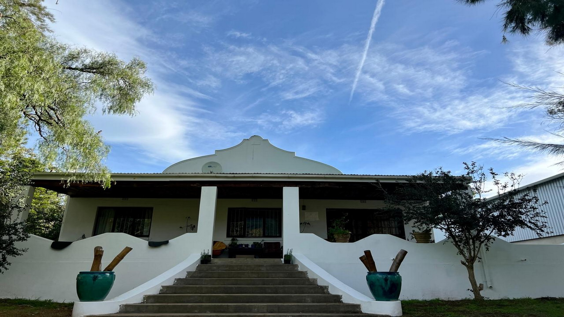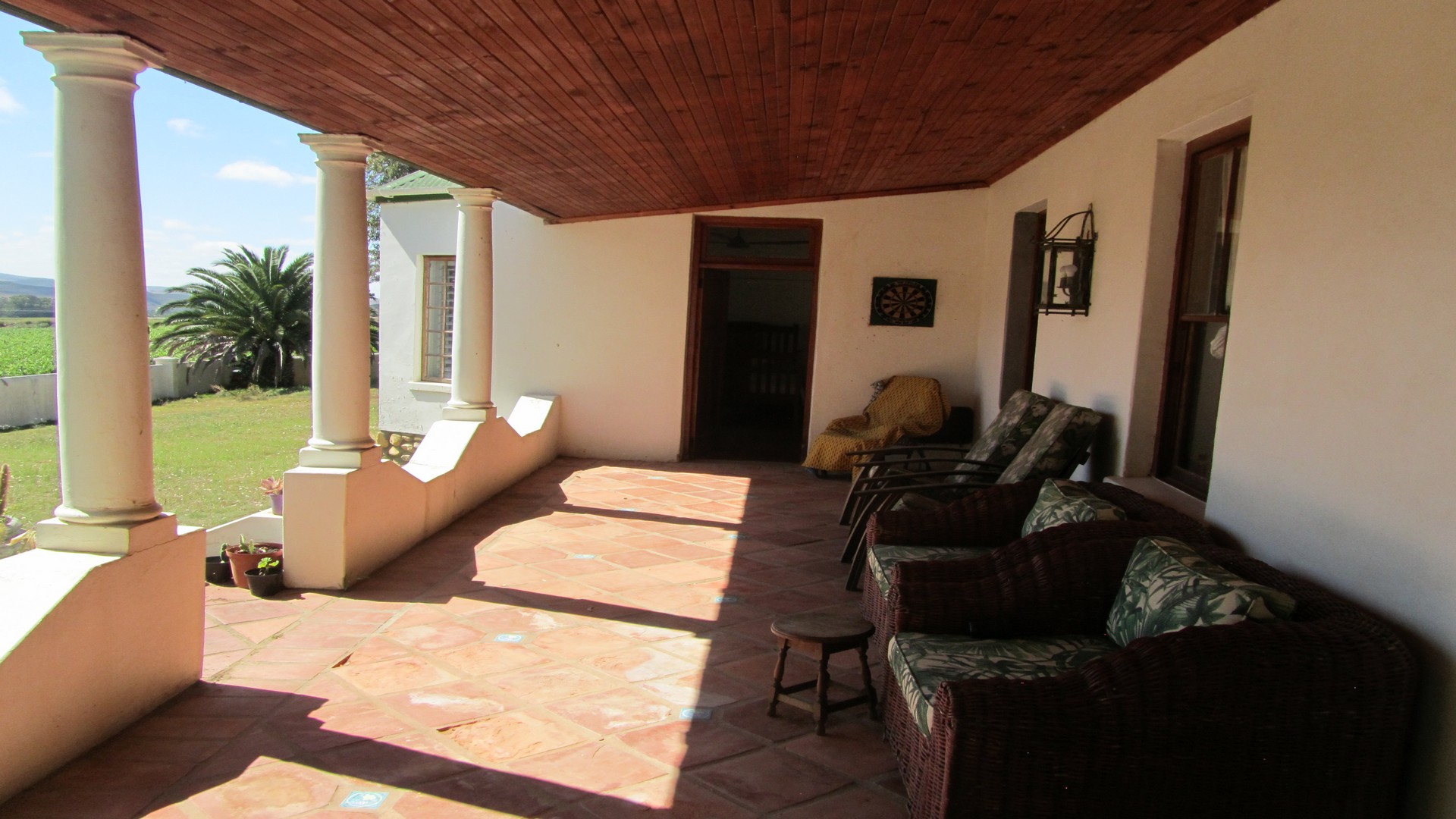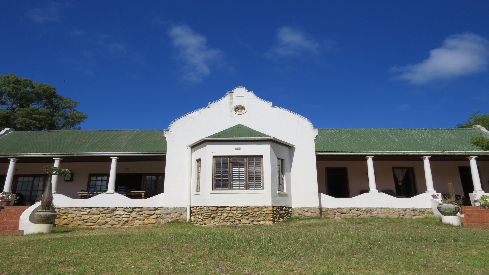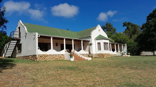 Gabled Manor House: (340 SQM): Built in 1933 and extensively restored and extended during 1996 with two large verandas overlooking the Langeberg Mountains. Complete with cosy farm kitchen, 4 bedrooms 3 of which are en-suite, two lounges and a reception room. Between the kitchen and four car garage is a large shady braai area.