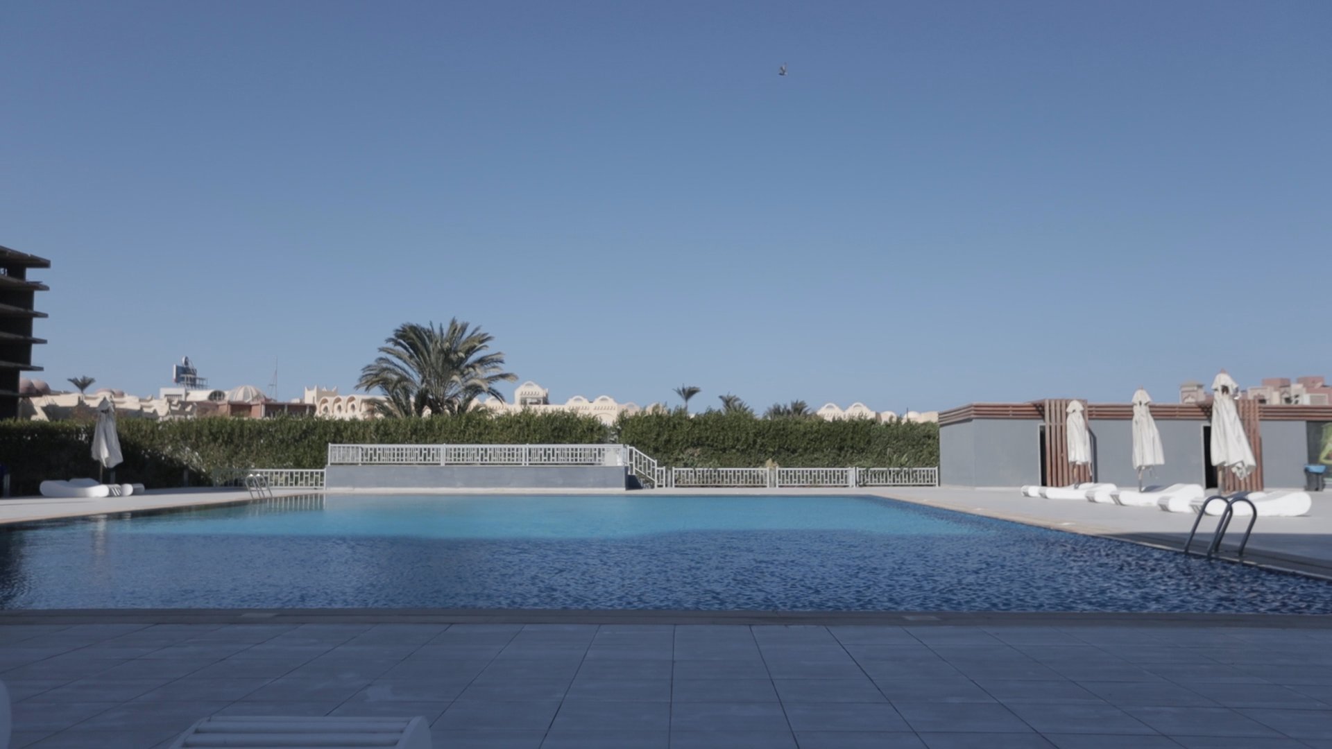 Three swimming pools surrounded by landscaped gardens