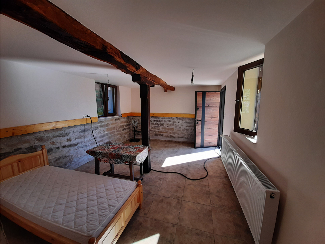 Renovated and furnished country house with big barn and spacious yard situated in a quiet area within the limits of a small village 100 km away from Sofia, Bulgaria. The property has access to three streets. The main gate provides access from a side street which is not frequently used. Through the small gate you get into the yard and reach the house. This building has two levels which are connected via external staircase made of carved stone blocks. If you continue further away you can access the ground floor of the house where four premises are situated - living room, kitchen, one bedroom and bathroom with a toilet. Going up the stairs you get to the second level which holds corridor, master bedroom, dining room, kitchen and one more bathroom. The house had been extensively renovated recently and received new coat of paint and plastering on the outside as well as external insulation. On the inside all floors are new, the walls have been stripped down, replastered and repainted, all the wiring, plumbing, windows and doors are brand new. The house also has central heating system which keeps the place nice and warm in the winter days. The roof had been revised and repaired too. It received new coat of paint and gutters. The yard is still undergoing clearing and repairs as if the place does not get sold, the current owners have more plans and ideas about it. The barn is located near the house and represents a big, spacious two-storey structure which can be rebuild and turned into a guest house, second house, workshop with garage and storage area, etc. The driveway is located behind the house and has direct access to the yard and the barn so delivery of various materials is not a problem therefore the barn can also serve as a business premise. The yard is divided in two section – front, which holds the house, the barn and plenty of open space, and back, which is mainly covered with grass and used to be an orchard back in the old days. Some of the fruit trees are still in place and in good shape so one can take good care of them and enjoy the ripe fruits like cherries, apples, plums, etc. The village where the property is situated is several kilometers away from train stop, river and monastery. Along the river banks one can find plenty of nice spots for fishing and camping. There are two towns within about 15 km distance from the house. One of them is the center of the local municipality and seat of the local council. It provides good transport connections with the national capital city Sofia, the regional capital Vratsa and many other towns and village across the country. The town also has a hospital, fire department, police station, gas stations, many shops and stores, restaurant, a couple of bar and coffee shops, farmer`s market, etc. Great rural property with quiet location, plenty of outside space, clean air and nice views awaiting its new owners.