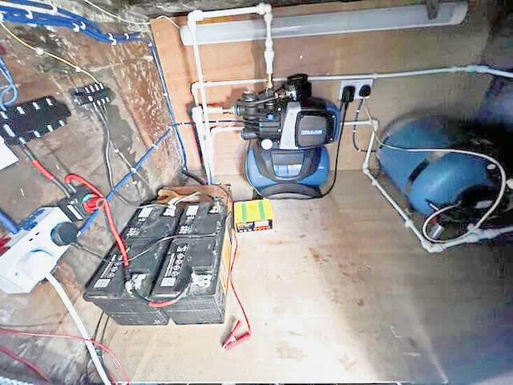 Hallway: Features ample storage, electric immersion heater, hot water boiler, washing machine, and battery storage area.
