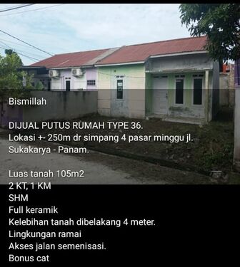 Rumah Murah Type 36 di dekat Jalan Suka Karya, Daerah Pinggiran Kota Pekanbaru, Provinsi Riau.