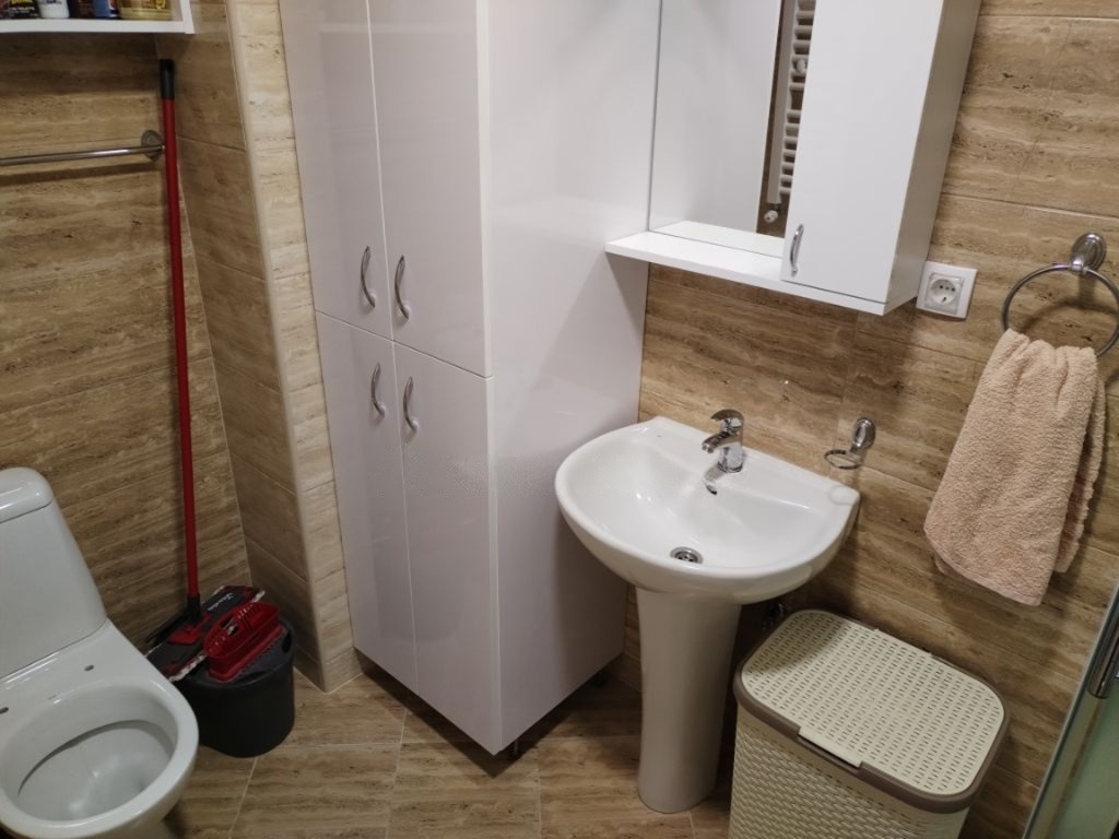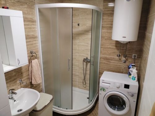 The apartment is located on the ground floor (above the garage) and consists of a living room with a kitchen, a bedroom, a hallway, a bathroom and a closed terrace (sliding windows). It is positioned so that it is not exposed to strong sunlight in the summer.