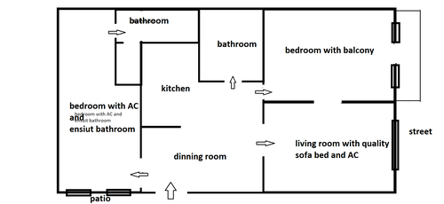 The 83 mn2 inculdes 3 nice size of rooms between 15- 22 mn2 , all rooms has separated , individual entarnce . There are 2 full bathrooms , one ensuit and connected to the courtyard bedroom (walk in rain shower , toilet , sink ) . The other bathroom acsess from the dinning room , it has bathtub with shower , sink and toilet too .