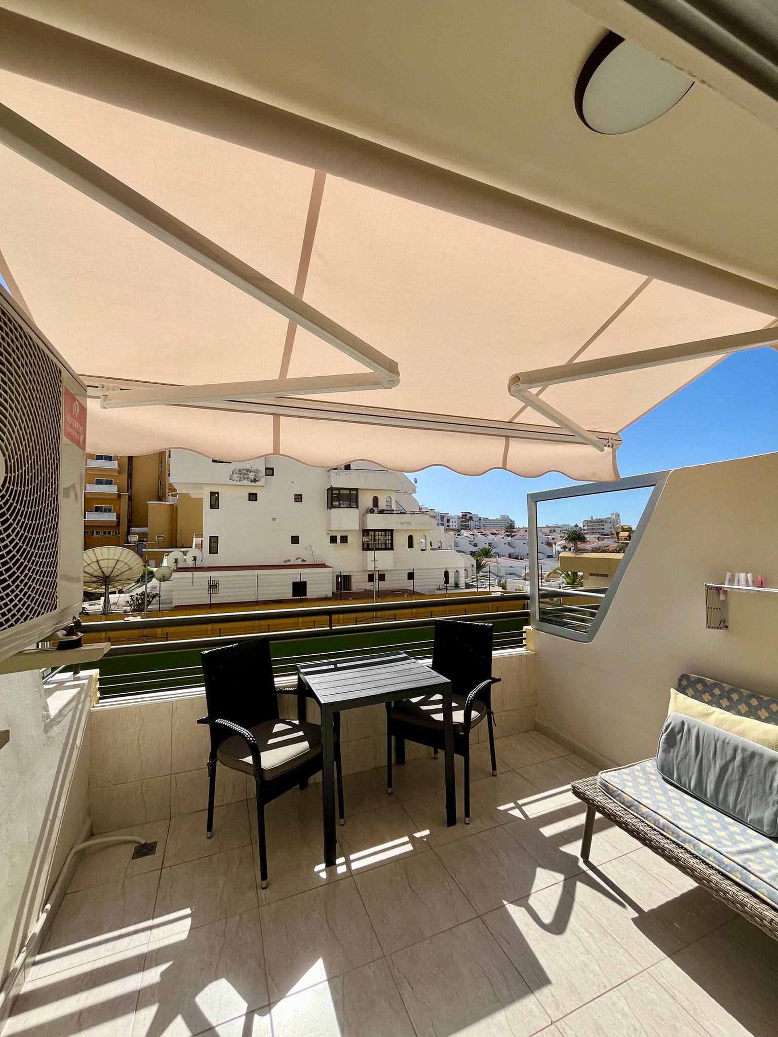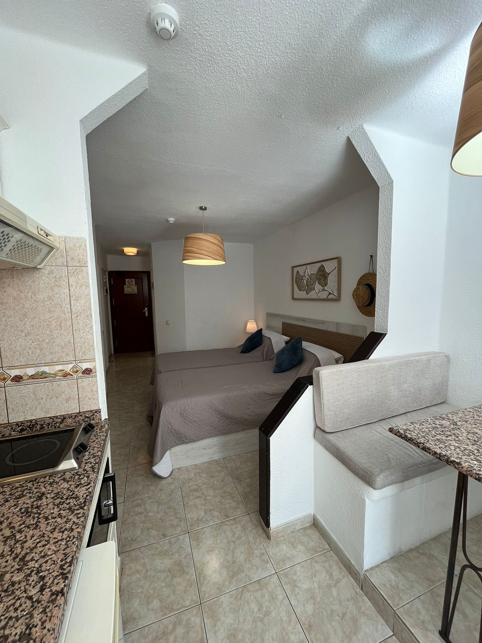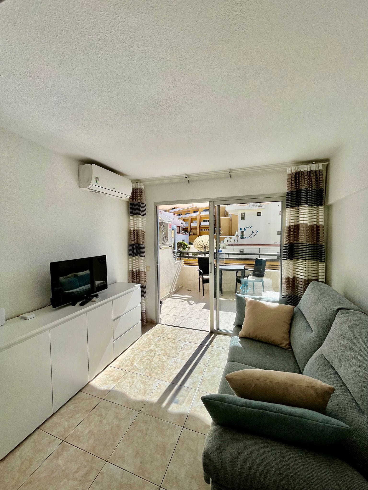 The studio seamlessly transforms into a living room with an open-plan kitchen, creating a practical and welcoming environment. The living area opens onto a balcony with partial ocean views, ideal for relaxing, sunbathing and enjoying the year-round climate of Costa Adeje.