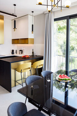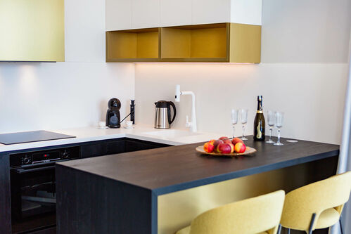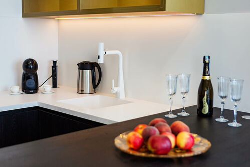 Built-in kitchen with appliances. Built-in wardrobes