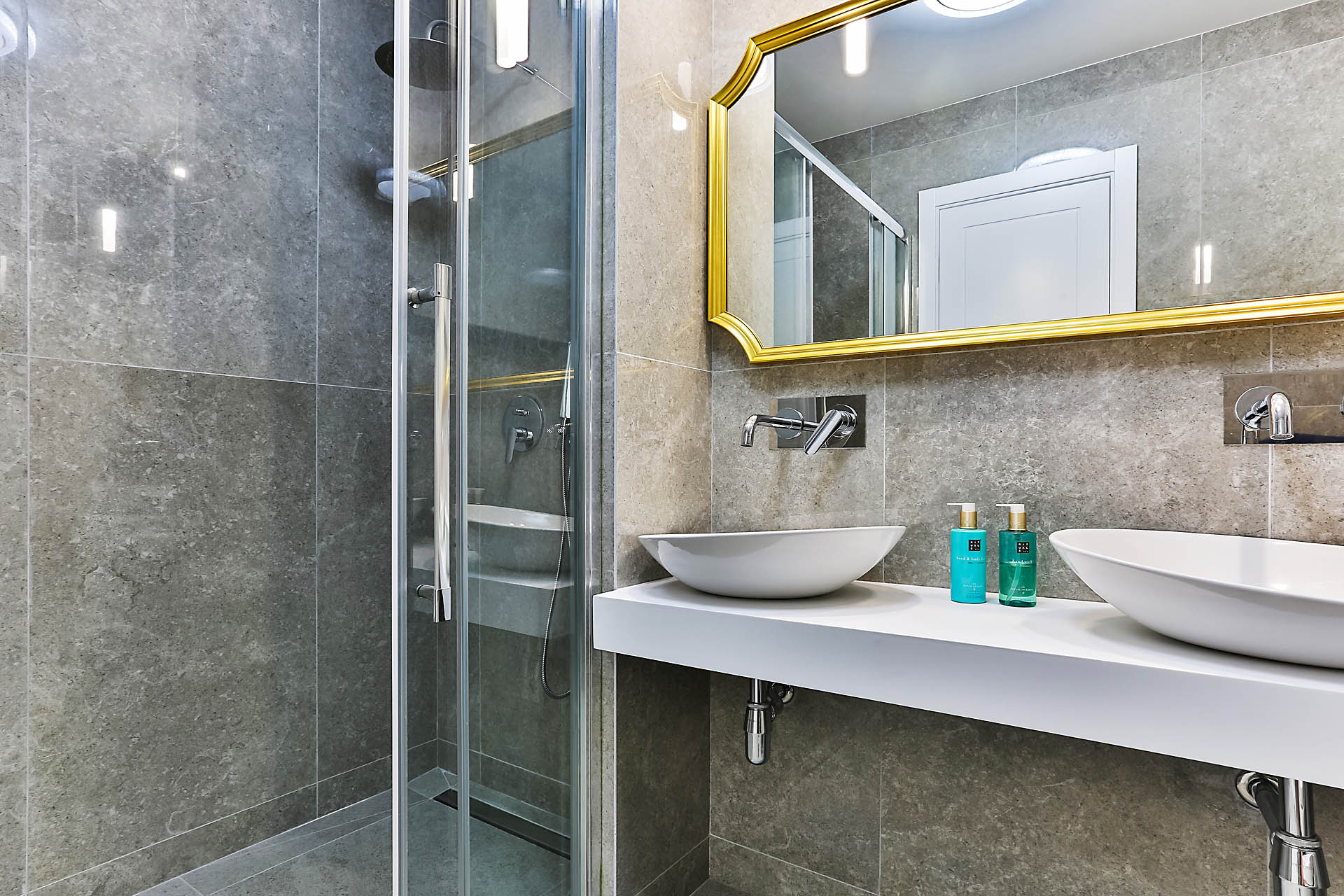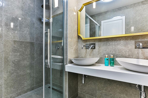 Complete set of plumbing fixtures, including Villeroy & Boch ceramics, chrome faucets, and spacious shower cabins