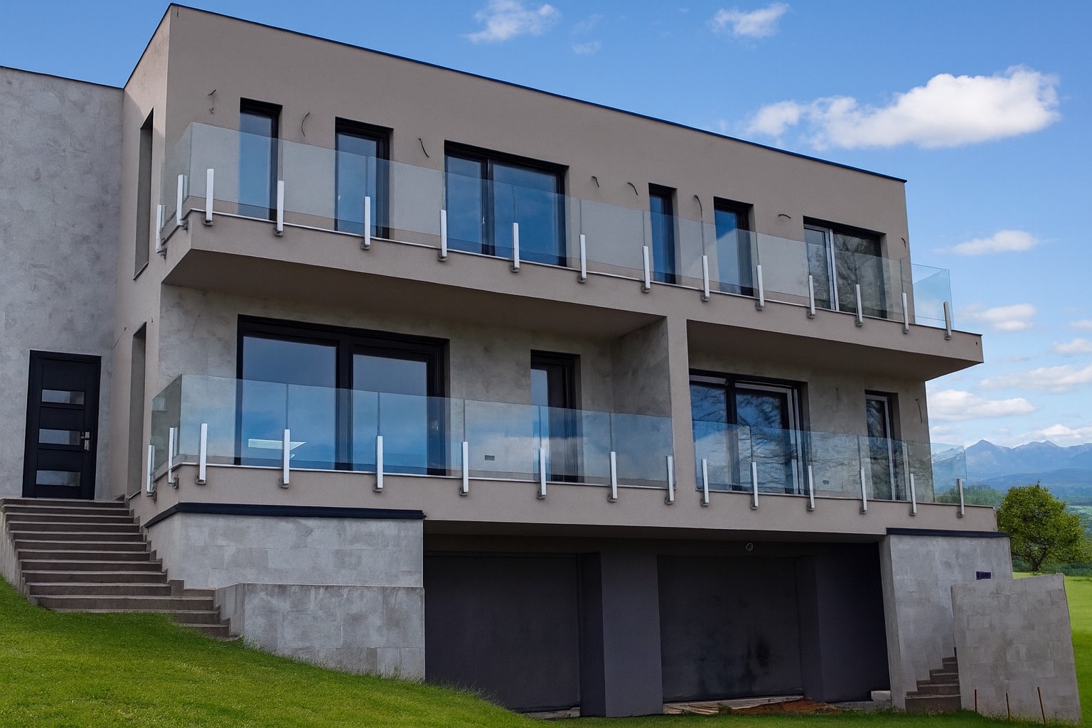 The main living level features a bright open-plan living room with an American-style kitchen, a pantry, a guest bathroom, and a panoramic balcony. There is also direct connection to the garden from this level. The bright living area creates a comfortable and elegant living environment where the surrounding nature becomes part of everyday life. The rear terrace can also be transformed into a winter garden or an inspiring home-office space with relaxing views of the garden.