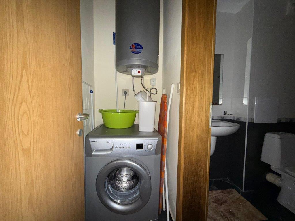The apartment has a total area of 54 sq.m. and offers a functional layout including a spacious living area with kitchen and dining space, a bathroom with toilet, a utility room, and a balcony overlooking the pool. The property is sold fully furnished and equipped, ready for immediate use or rental.
