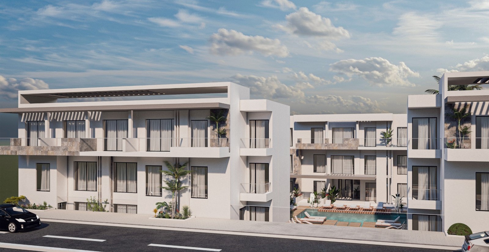 swimming pools and lush green spaces.