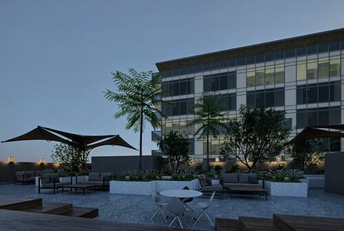 The development includes two floors dedicated to commercial and administrative spaces, topped by four typical residential floors.
