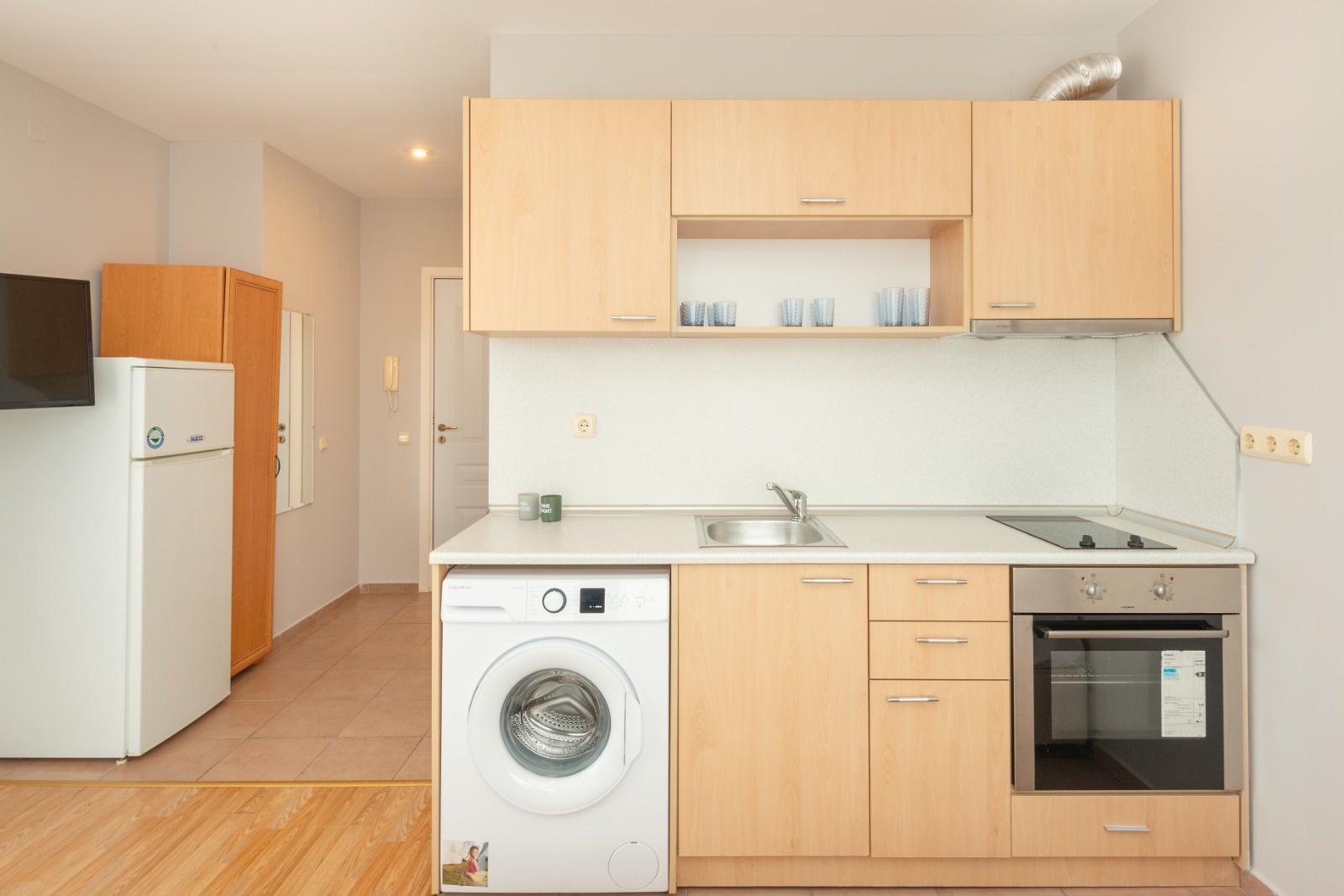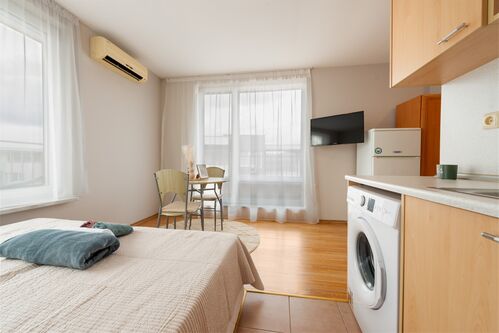 The studio is 42 sq.m. and offers an entrance hall, one room with kitchen and sleeping area, a big balcony with pool view and a bathroom, equipped with a shower cabin, toilet, washing machine and a sink.