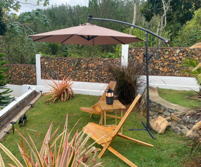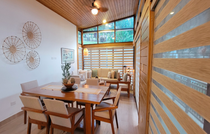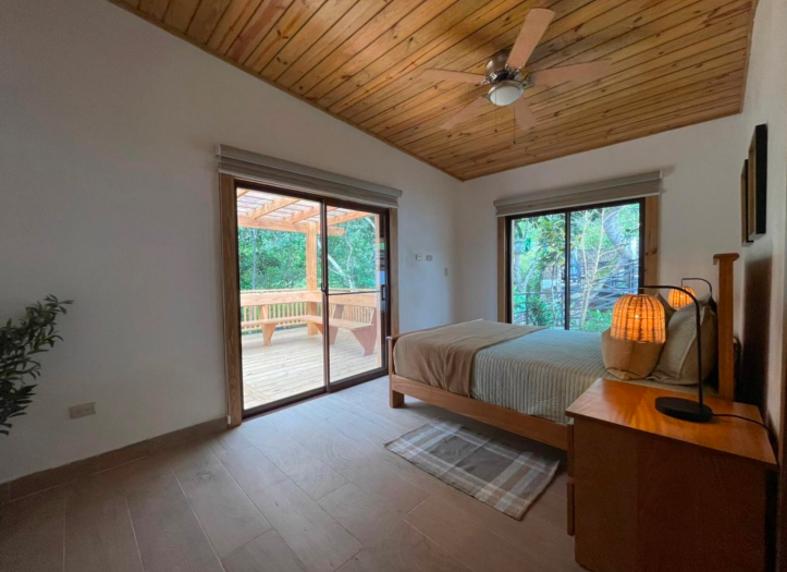 Features: This is a stunning split-level villa built with high-quality concrete blocks and elegant wood siding. It features durable concrete flooring between levels, and a beautiful wood-framed roof with Aluzinc (premium metal roofing) for maximum weather protection. All windows are crafted from glass and metal, while the closets, kitchen cabinets, and doors are made from fine tropical hardwood.