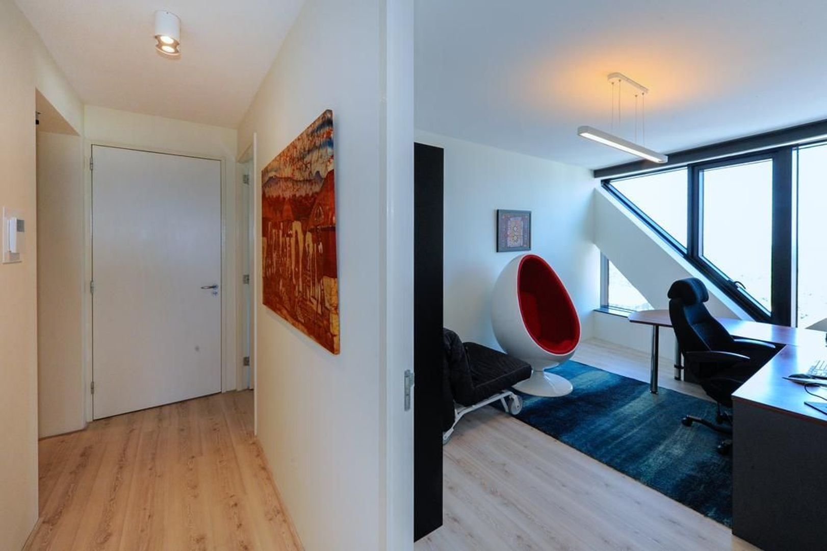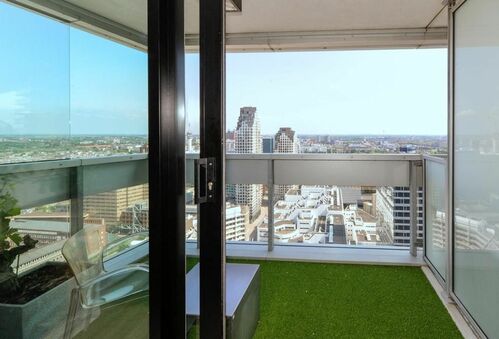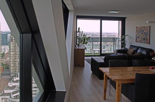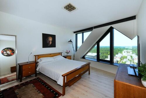 Het appartement beschikt over een ruim en licht interieur van circa 107 m², zorgvuldig ontworpen en afgewerkt met hoogwaardige materialen. Grote driehoekige ramen aan de noordoostzijde en kamerhoge ramen aan de zuidoostzijde creëren een indrukwekkend gevoel van ruimte en bieden een adembenemend 270° uitzicht dat zich uitstrekt van de Noordzee tot Leiden, Amsterdam, Utrecht, Rotterdam, Delft en Hoek van Holland. Een privébalkon van circa 7 m² verlengt de woonruimte naar buiten en biedt een perfecte plek om te genieten van de skyline van de stad.