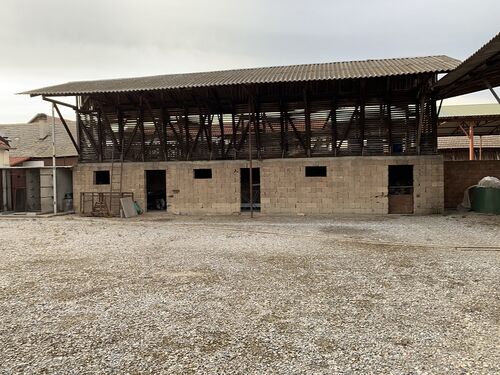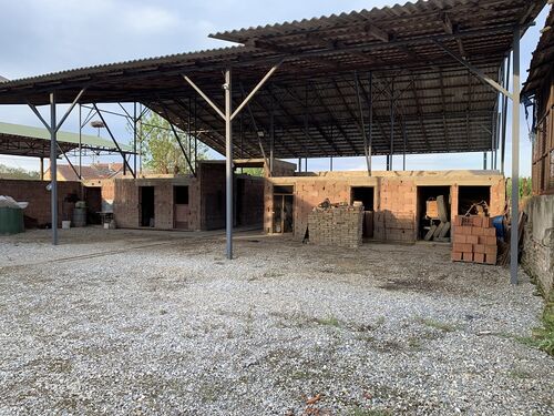 The layout includes a spacious living room, a dining area with a kitchen, a bathroom and three bedrooms. A covered terrace is perfect for outdoor relaxation. The yard features auxiliary buildings with a total area of 73 m² and a large 385 m² economic building suitable for various purposes. At the entrance, there is a detached garage of 22 m² with driveway access.