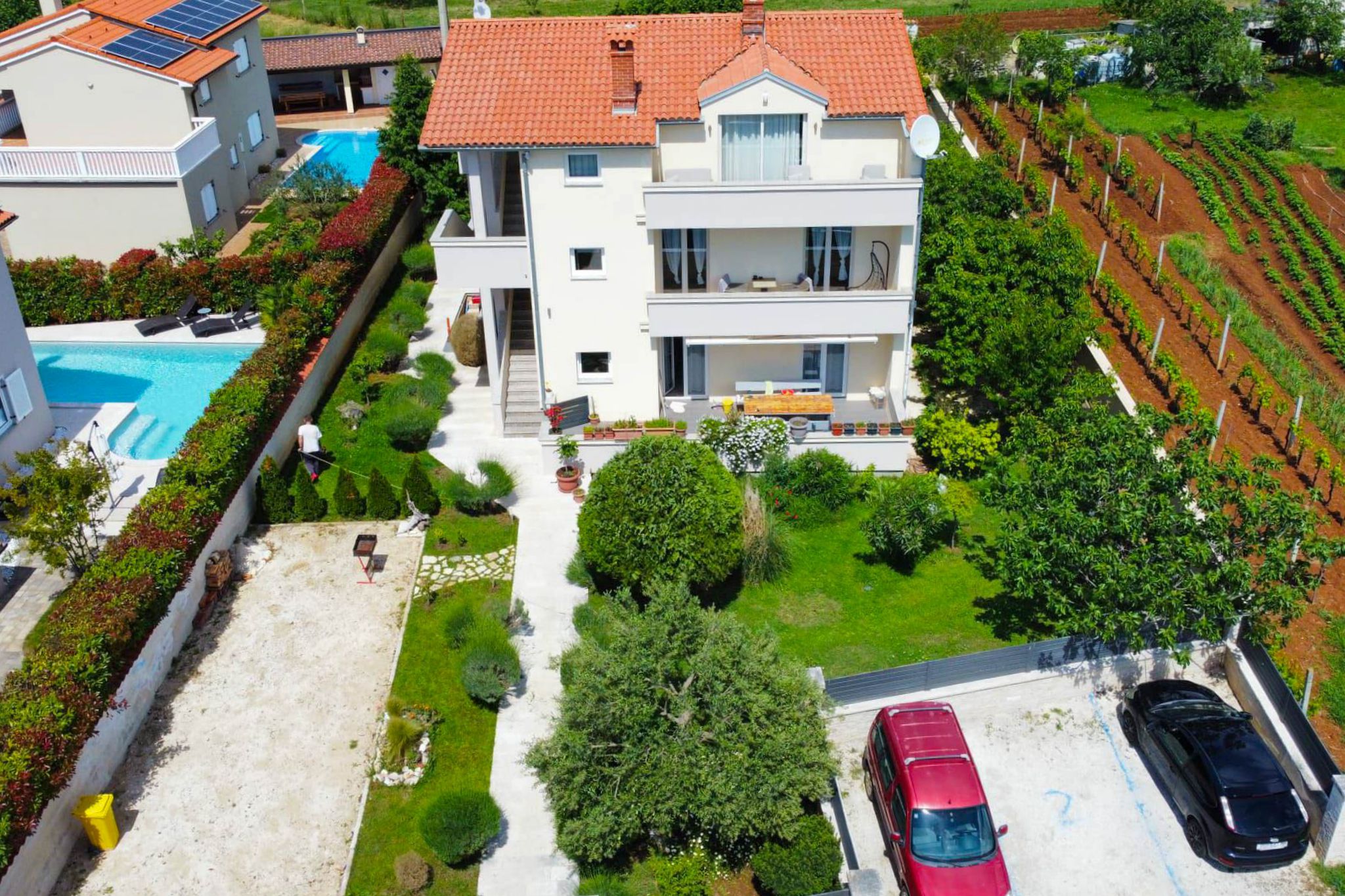 House for sale in a prime location, just 6 km from the historic and tourist city of Pula. The property consists of three residential units (each 107 m²) plus approximately 100 m² of additional service spaces, including a tavern with fireplace, kitchen, bathroom, gym, and a basement. The plot measures 1,100 m² and features a fully landscaped and well-maintained garden with cherry, pear, apple, fig, and olive trees, as well as lavender and other Mediterranean plants. The property includes a large private swimming pool. Located in a peaceful area surrounded by nature and forests, while remaining close to the city and main roads. Private sale. No agency fees. Agencies excluded.