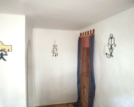 To the left is a cosy living room with a traditional wood burner, a great place to relax on chilly winter nights. There are superb views of the surrounding mountains through the window at the rear of the room. Because of the thickness of the walls, this is also a cool room in the hot summer months. A door leads through to a small hall with a bedroom and the bathroom off. The spacious double bedroom has freestanding furniture and a built-in wardrobe. The bathroom features a slate topped vanity unit with a traditional ceramic washbasin and a bathtub with shower over.