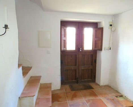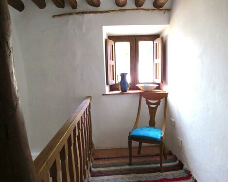 The main entrance has double doors and leads into a welcoming entrance hall with a large storeroom to the left and an alcove containing a washing machine to the right. Terracotta tiled stairs lead up to the characterful first floor landing. From here is accessed the dining room and the living room. The dining room has wonderful wooden beams and space for a dining suite and side furniture. Through an arch and down a couple of steps is the Alpujarran style kitchen, featuring wooden fronted cupboards, a double porcelain sink and tiled work surfaces.