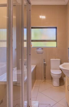 Bathroom 1 with basin, shower, toilet and tiled floors