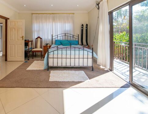 Main bedroom with balcony, sliding doors, TV aerial, built-in cupboards, king bed and tiled floors