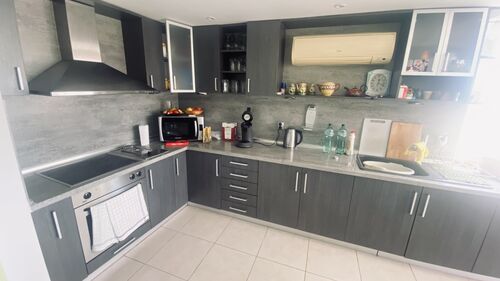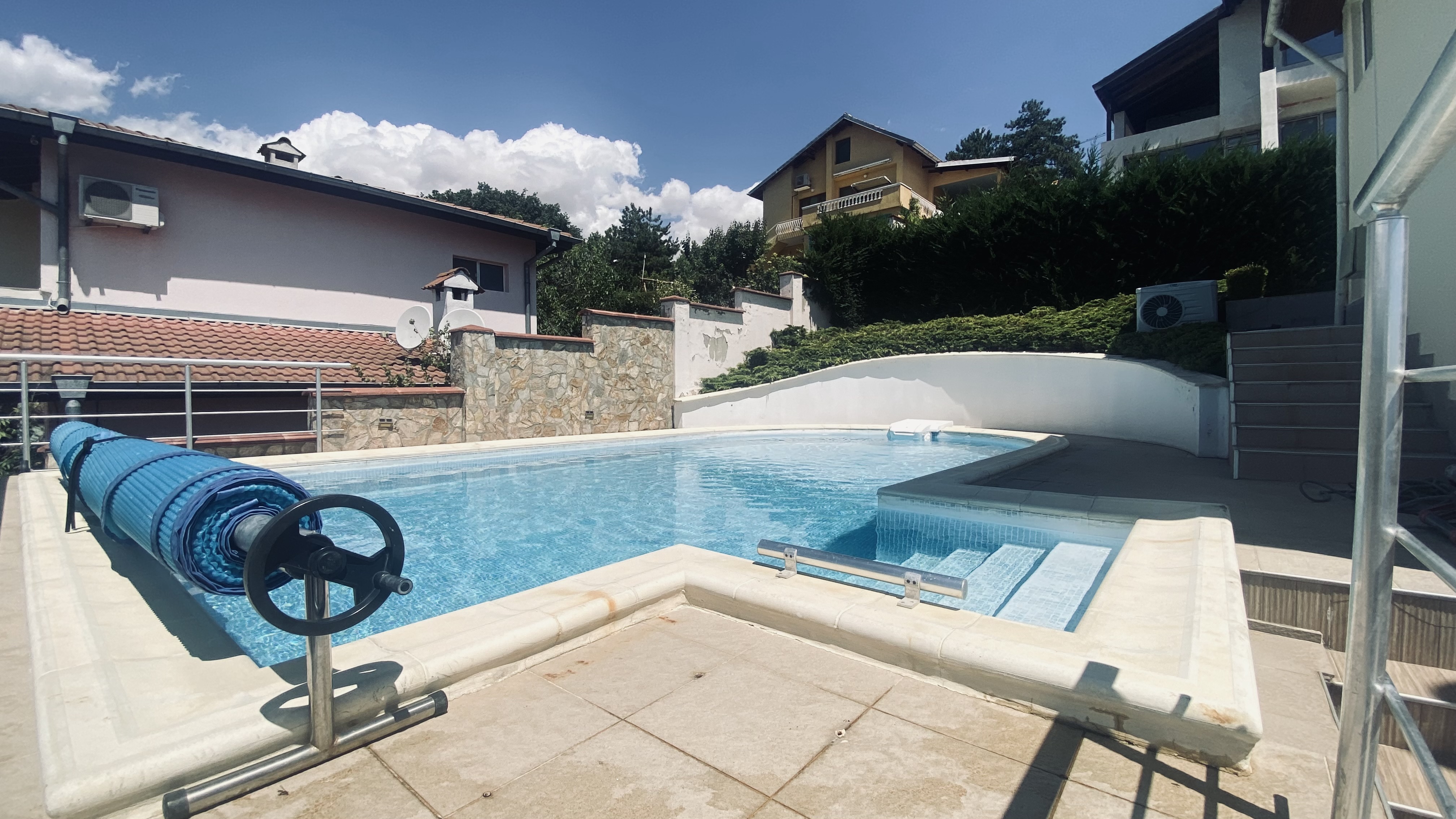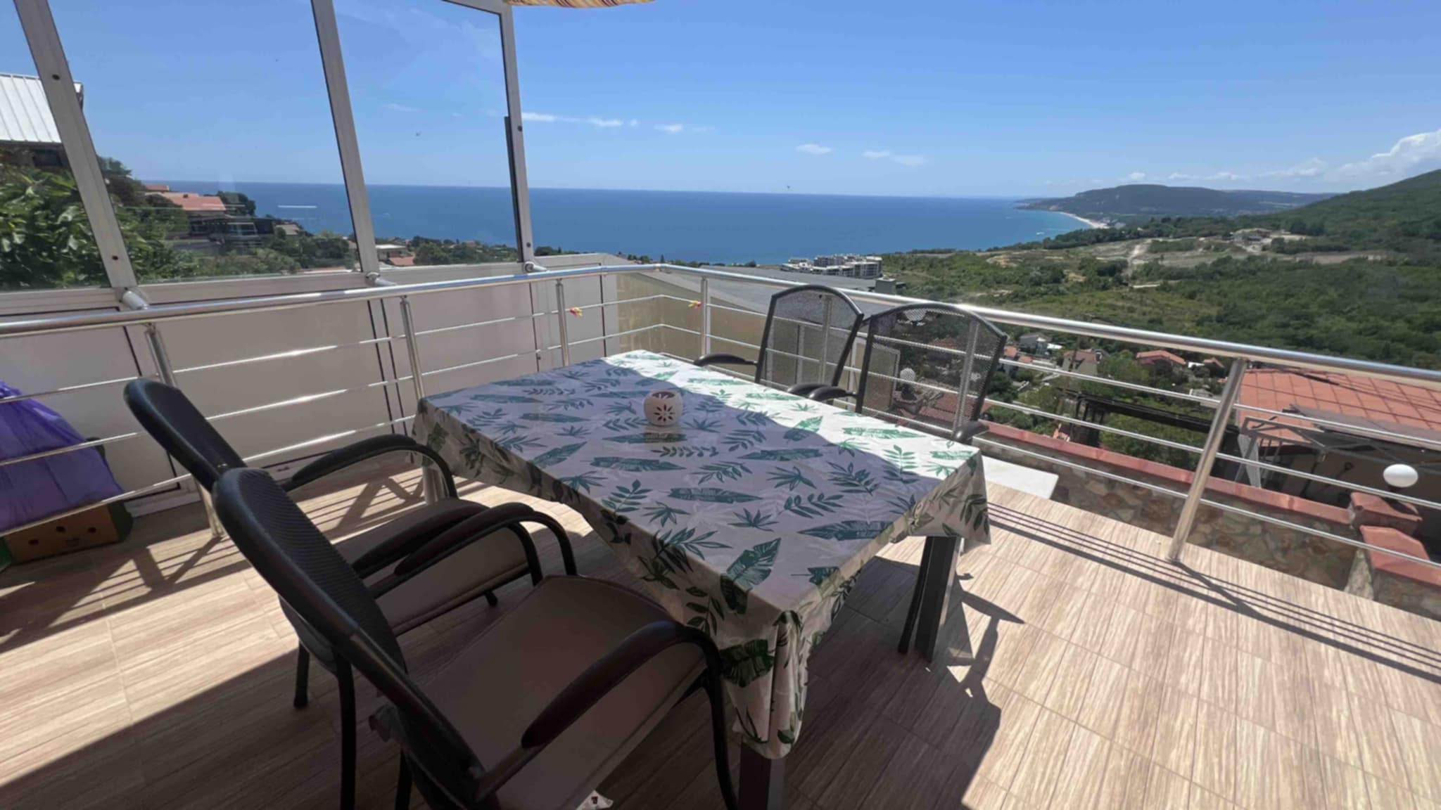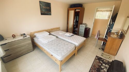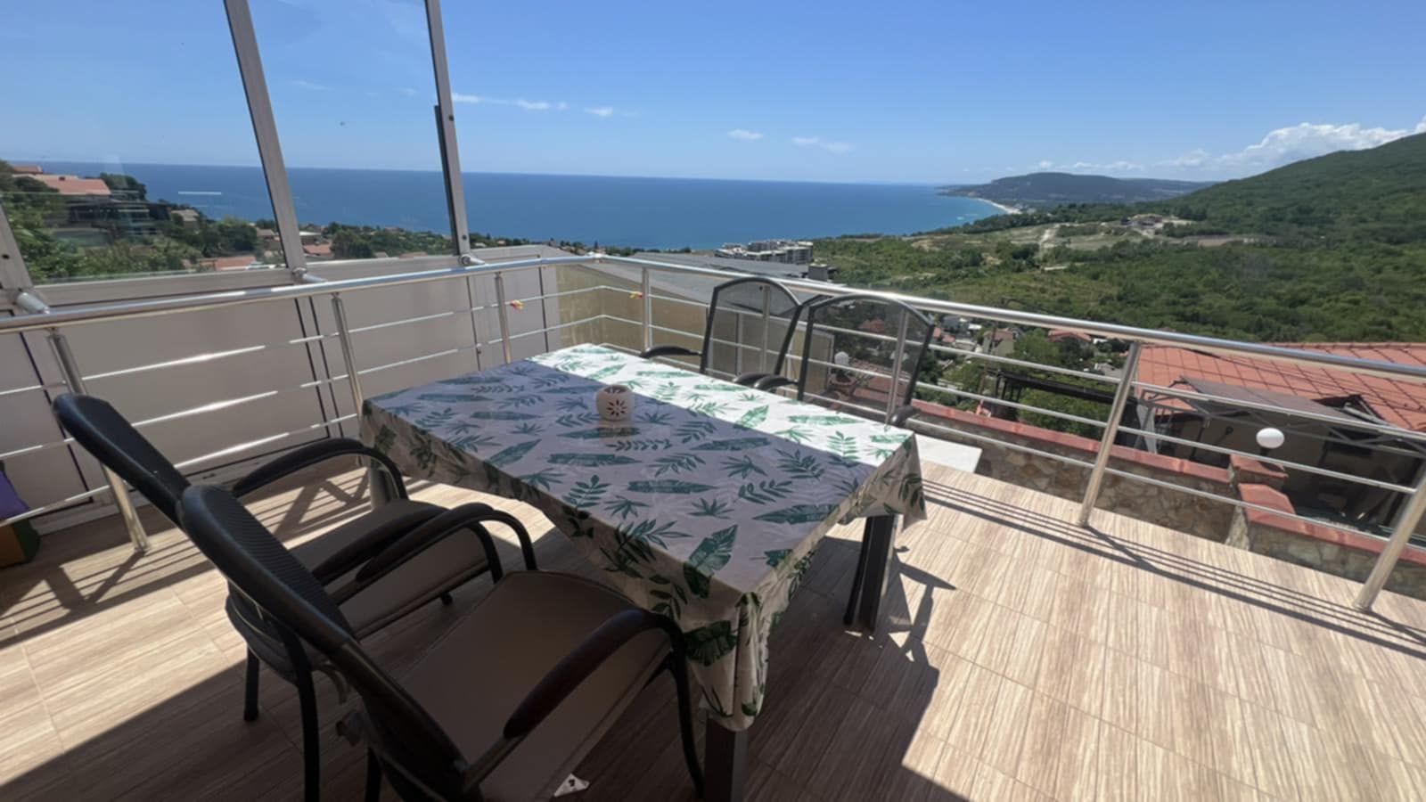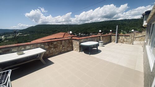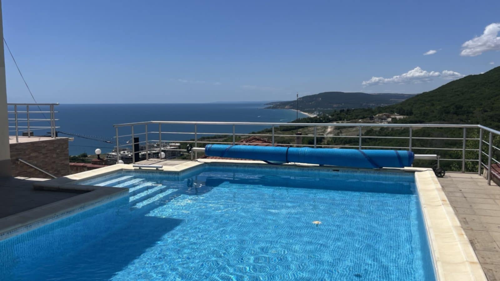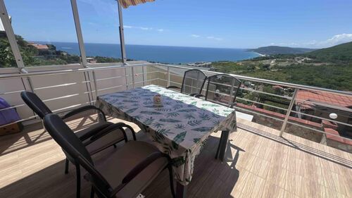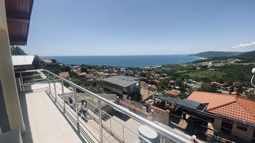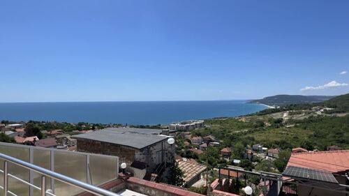 The house is set on a plot of 380 sq.m and offers a total built-up area of 160 sq.m, distributed over three levels. The first level (20 sq.m) includes two separate rooms with a bathroom, suitable for a guest room, fitness, office, or storage. The first floor impresses with a spacious living room with a kitchen area, a bathroom, service rooms, and a large panoramic terrace with a magnificent sea view. The second floor offers two comfortable bedrooms, a bathroom, a separate toilet, and another large terrace with an unobstructed sea view. The property stands out with its solid construction, natural stone cladding, modern furnishings, and fully equipped kitchen. The landscaped yard is impeccably maintained, and the panoramic swimming pool is equipped with an automatic cleaning system and a separate drinking water purification system. The house also features a 20 sq.m garage with an automatic door, providing additional comfort and parking convenience. All these elements make the property not only aesthetically appealing but also functional and ready for immediate use. Villa zone -Izgrev- is situated on a picturesque hill above Balchik, in a green and peaceful area offering a unique frontal sea view. The location combines seclusion amidst nature with quick access to the city center, the seashore, the marina, and the famous landmarks - the Palace and the Botanical Garden. This is a property that combines style, comfort, and a prestigious location, ideal both for personal use and as an investment with high potential. situation : Town of Balchik Two-storey house with an impressive frontal sea view