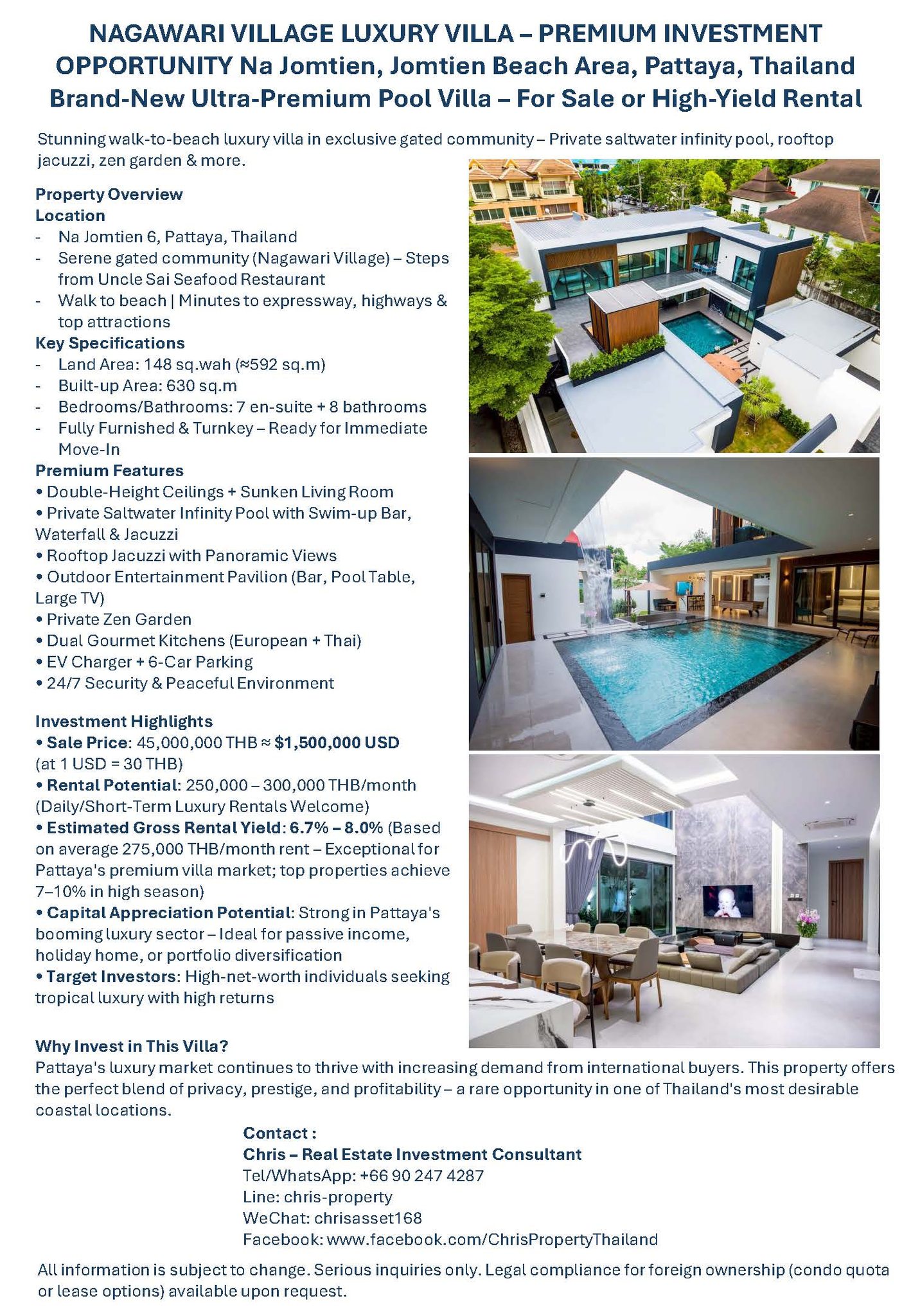 - Estimated Gross Rental Yield : 6.7% – 8.0% (based on average 275,000 THB/month rent – exceptional for Pattaya's premium villa market, where top properties achieve 7–10% in high season)