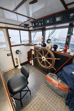 Access is through the wheelhouse, a large and functional space that remains fully equipped for navigation but also serves perfectly as a social area or home office when not cruising.